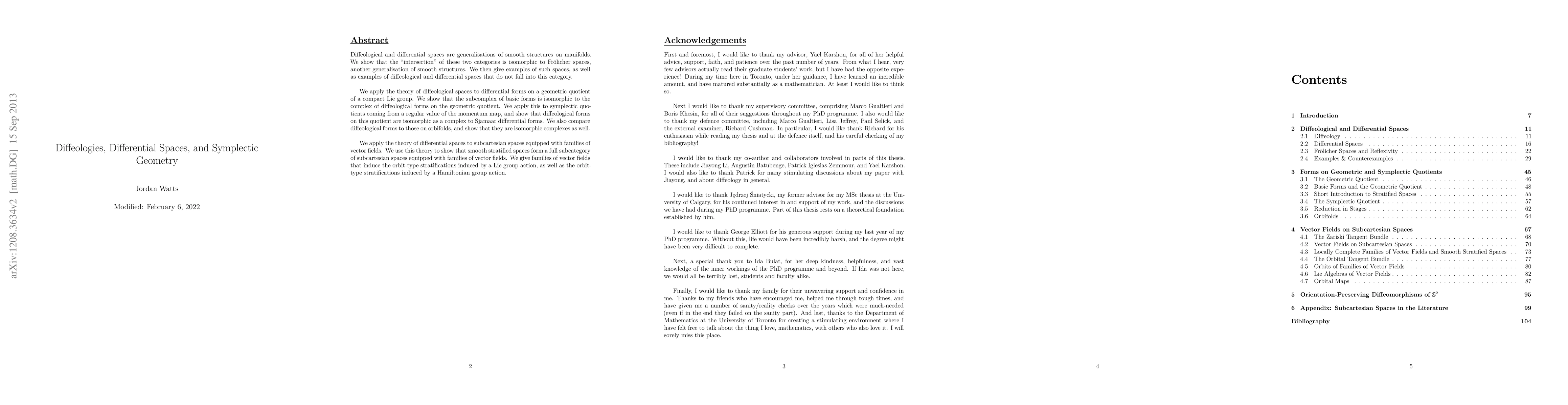 This paper explores the relationship between diffeological spaces, differential spaces, and Fr\"olicher spaces, showing their "intersection" is isomorphic to Fr\"olicher spaces. It applies diffeological spaces to symplectic geometry, demonstrating isomorphisms between basic forms and diffeological forms on geometric quotients, and between diffeological forms and Sjamaar differential forms on symplectic quotients. Additionally, it uses differential spaces to analyze smooth stratified spaces, proving they form a subcategory of subcartesian spaces with families of vector fields.