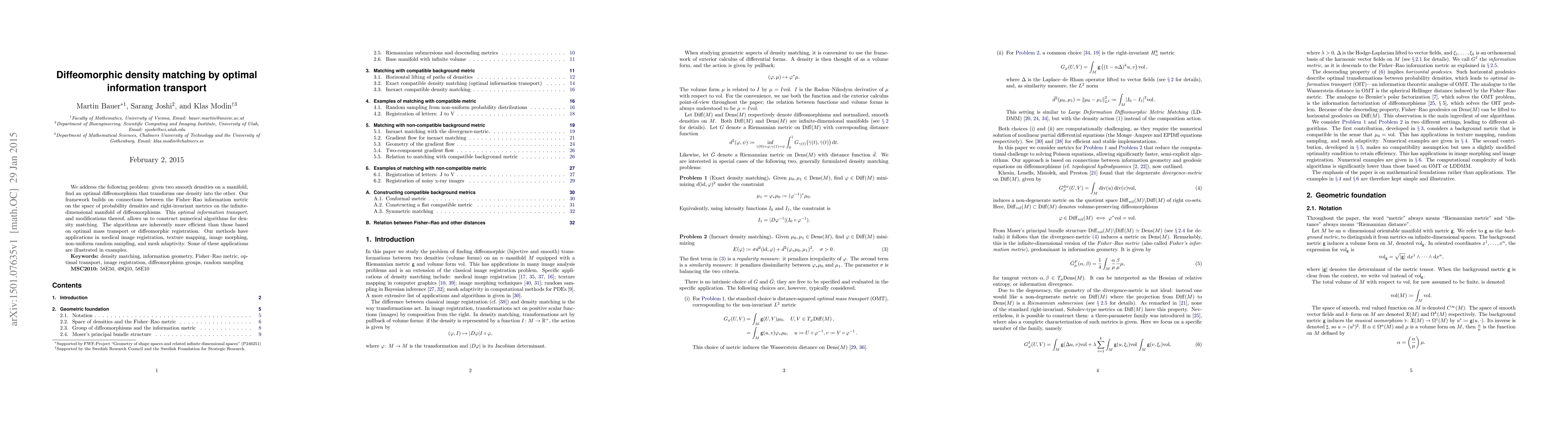 We address the following problem: given two smooth densities on a manifold, find an optimal diffeomorphism that transforms one density into the other. Our framework builds on connections between the Fisher-Rao information metric on the space of probability densities and right-invariant metrics on the infinite-dimensional manifold of diffeomorphisms. This optimal information transport, and modifications thereof, allows us to construct numerical algorithms for density matching. The algorithms are inherently more efficient than those based on optimal mass transport or diffeomorphic registration. Our methods have applications in medical image registration, texture mapping, image morphing, non-uniform random sampling, and mesh adaptivity. Some of these applications are illustrated in examples.