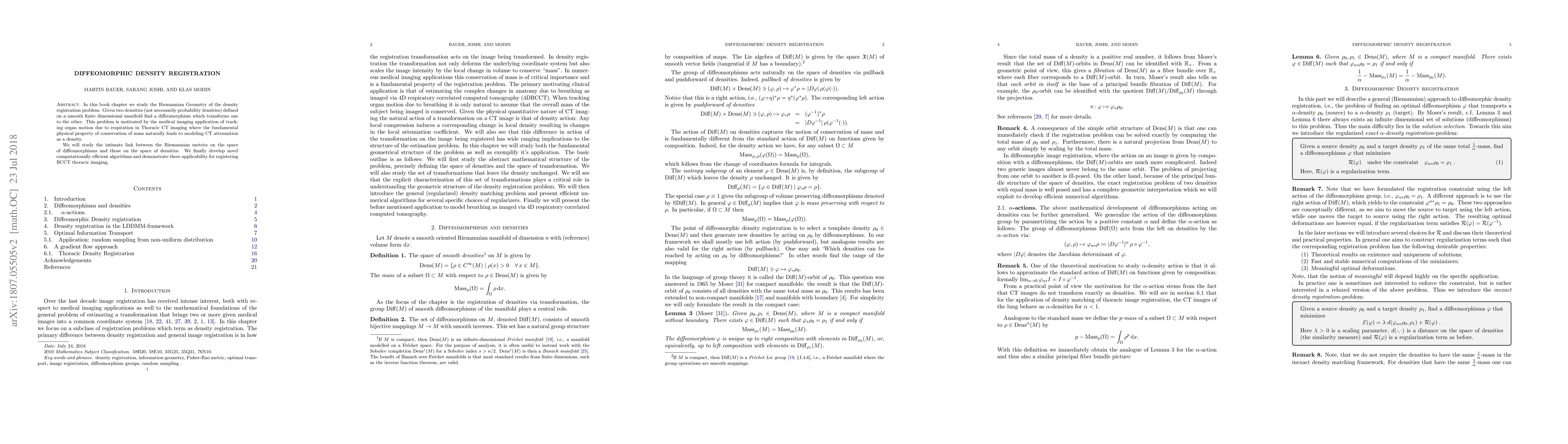 In this book chapter we study the Riemannian Geometry of the density registration problem: Given two densities (not necessarily probability densities) defined on a smooth finite dimensional manifold find a diffeomorphism which transforms one to the other. This problem is motivated by the medical imaging application of tracking organ motion due to respiration in Thoracic CT imaging where the fundamental physical property of conservation of mass naturally leads to modeling CT attenuation as a density. We will study the intimate link between the Riemannian metrics on the space of diffeomorphisms and those on the space of densities. We finally develop novel computationally efficient algorithms and demonstrate there applicability for registering RCCT thoracic imaging.