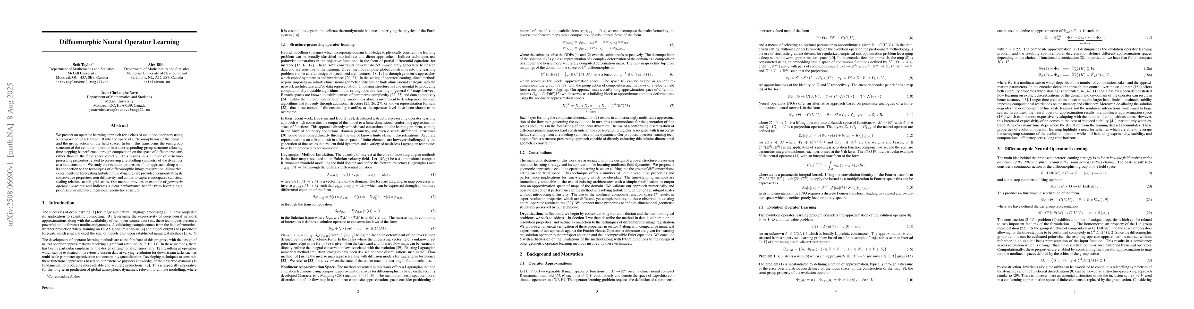 The paper proposes a diffeomorphic neural operator learning approach, transforming the evolution operator problem into a lifting into the space of diffeomorphisms and the group action on the field space, ensuring structure-preserving properties and geometric operator learning.