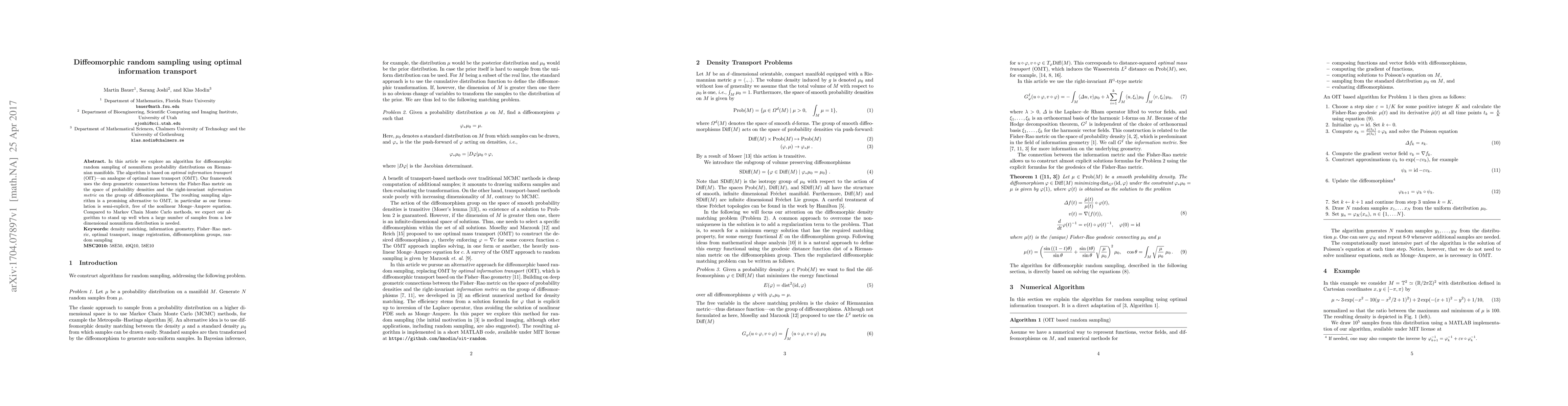 Researchers develop an algorithm for diffeomorphic random sampling of nonuniform probability distributions on Riemannian manifolds using optimal information transport, offering a promising alternative to traditional methods with semi-explicit formulation and no nonlinear Monge-Ampere equation.