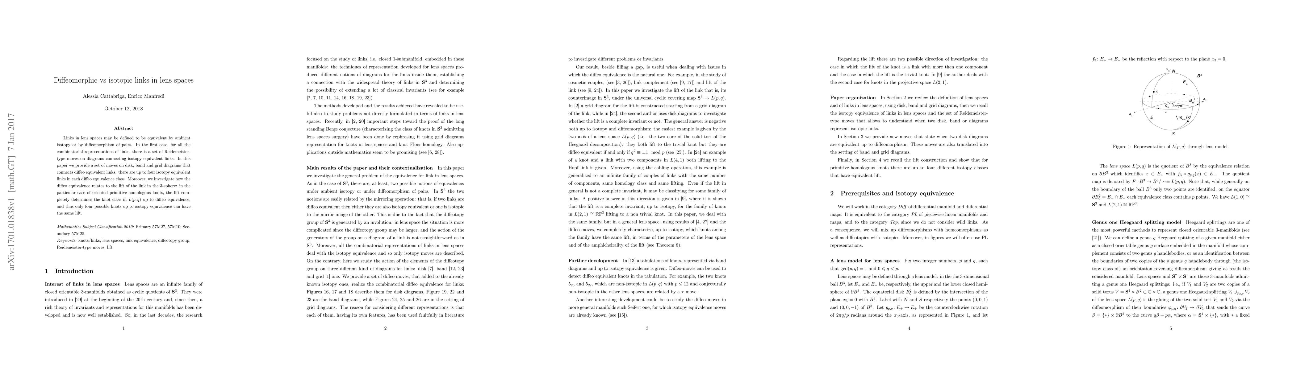 This paper introduces a set of moves connecting diffeo equivalent links in lens spaces and explores the relationship between diffeo and isotopic equivalence. It finds that each diffeo equivalence class may contain up to four isotopic links, particularly noting that oriented primitive-homologous knots lift uniquely in the 3-sphere, determining the knot class up to diffeo equivalence.