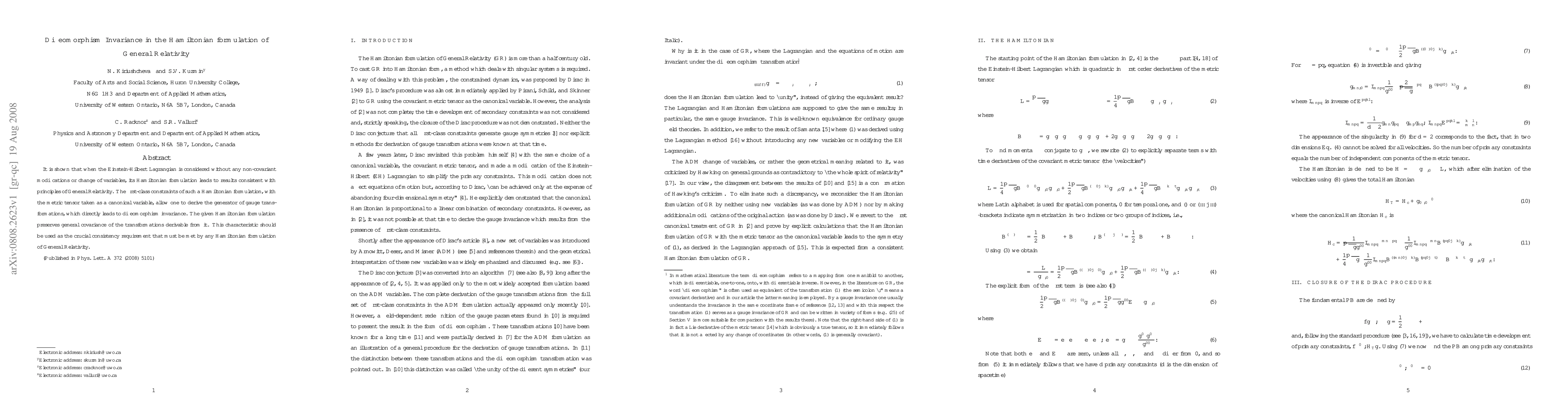 This paper demonstrates that the Hamiltonian formulation of General Relativity, derived from the Einstein-Hilbert Lagrangian without non-covariant modifications, maintains diffeomorphism invariance through first-class constraints and the metric tensor as a canonical variable. It emphasizes the importance of general covariance in any Hamiltonian formulation of General Relativity.