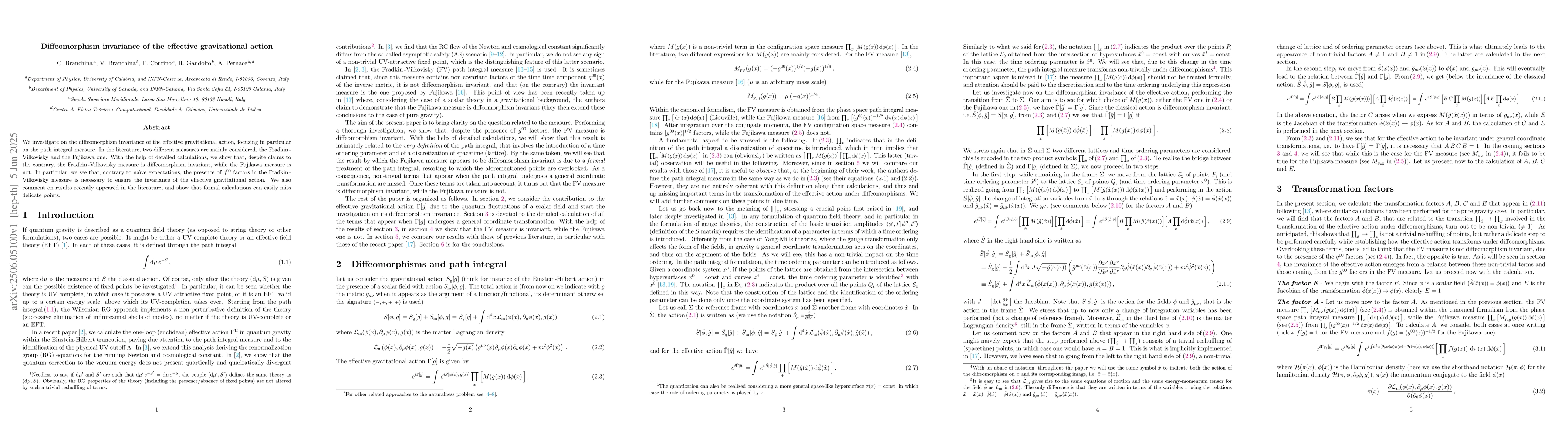 Researchers investigate the diffeomorphism invariance of the effective gravitational action using two path integral measures, finding that the Fradkin-Vilkovisky measure is diffeomorphism invariant but the Fujikawa measure is not.