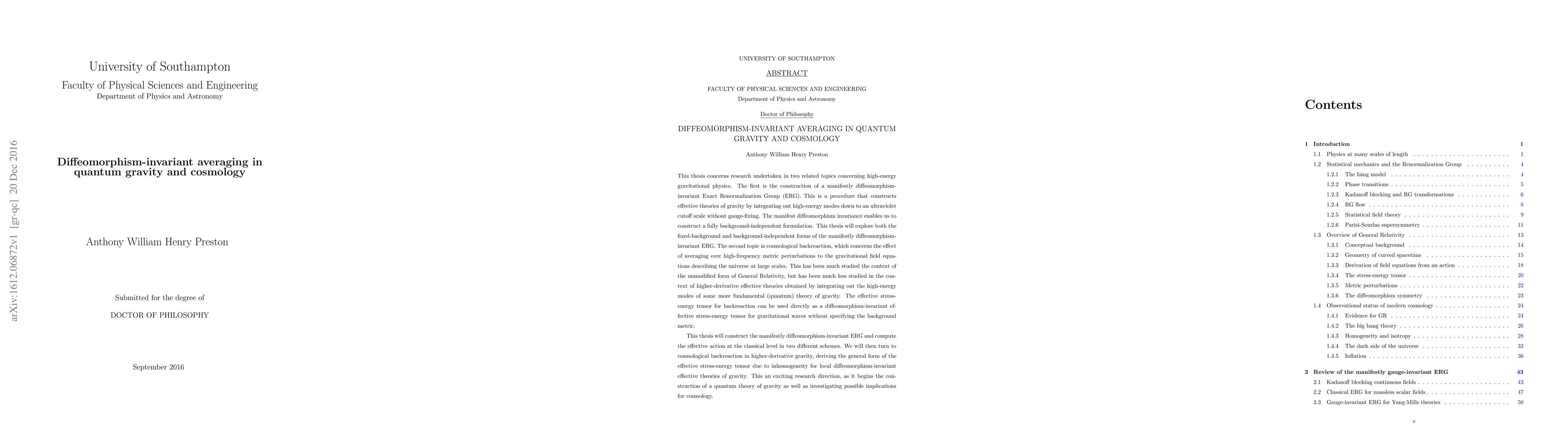 This thesis concerns research undertaken in two related topics concerning high-energy gravitational physics. The first is the construction of a manifestly diffeomorphism-invariant Exact Renormalization Group (ERG). This is a procedure that constructs effective theories of gravity by integrating out high-energy modes down to an ultraviolet cutoff scale without gauge-fixing. The manifest diffeomorphism invariance enables us to construct a fully background-independent formulation. This thesis will explore both the fixed-background and background-independent forms of the manifestly diffeomorphism-invariant ERG. The second topic is cosmological backreaction, which concerns the effect of averaging over high-frequency metric perturbations to the gravitational field equations describing the universe at large scales. This has been much studied the context of the unmodified form of General Relativity, but has been much less studied in the context of higher-derivative effective theories obtained by integrating out the high-energy modes of some more fundamental (quantum) theory of gravity. The effective stress-energy tensor for backreaction can be used directly as a diffeomorphism-invariant effective stress-energy tensor for gravitational waves without specifying the background metric. This thesis will construct the manifestly diffeomorphism-invariant ERG and compute the effective action at the classical level in two different schemes. We will then turn to cosmological backreaction in higher-derivative gravity, deriving the general form of the effective stress-energy tensor due to inhomogeneity for local diffeomorphism-invariant effective theories of gravity. This an exciting research direction, as it begins the construction of a quantum theory of gravity as well as investigating possible implications for cosmology.