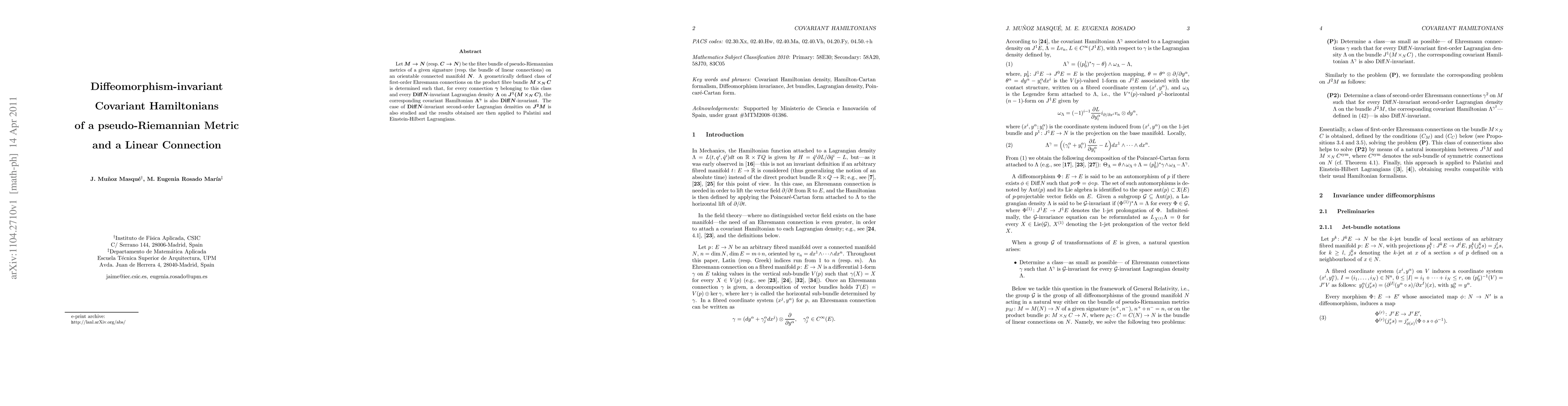 \noindent Let $M\to N$ (resp.\ $C\to N$) be the fibre bundle of pseudo-Riemannian metrics of a given signature (resp.\ the bundle of linear connections) on an orientable connected manifold $N$. A geometrically defined class of first-order Ehresmann connections on the product fibre bundle $M\times_NC$ is determined such that, for every connection $\gamma $ belonging to this class and every $\mathrm{Diff}N$-invariant Lagrangian density $\Lambda $ on $J^1(M\times_NC)$, the corresponding covariant Hamiltonian $\Lambda ^\gamma $ is also $\mathrm{Diff}N$-invariant. The case of $\mathrm{Diff}N$-invariant second-order Lagrangian densities on $J^2M$ is also studied and the results obtained are then applied to Palatini and Einstein-Hilbert Lagrangians.