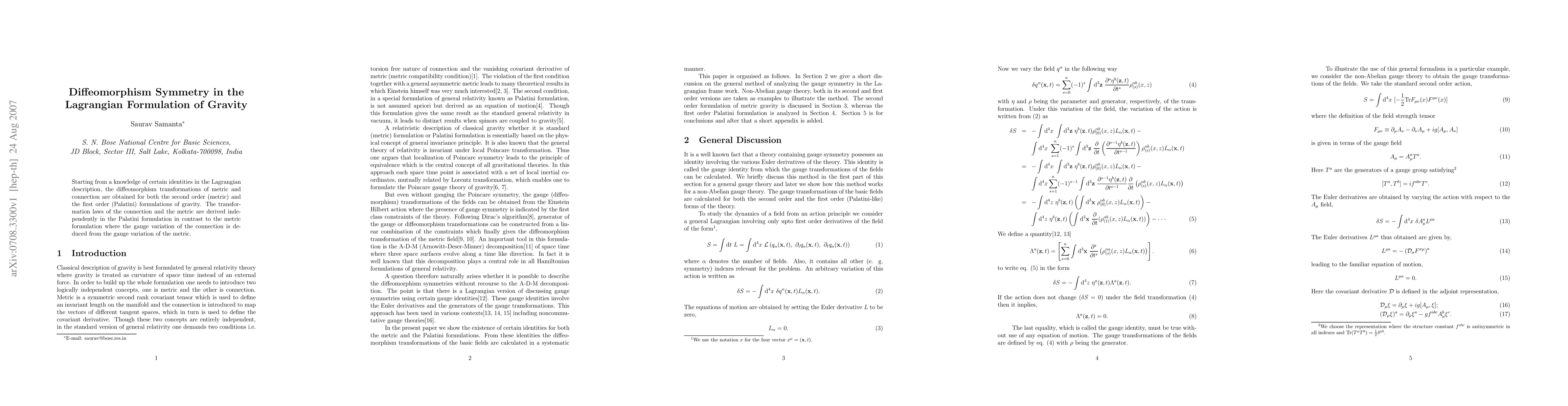 This paper derives diffeomorphism transformations for both metric and Palatini formulations of gravity, highlighting the independent derivation of transformation laws in the Palatini approach compared to the metric formulation where the connection's gauge variation follows from the metric's.
