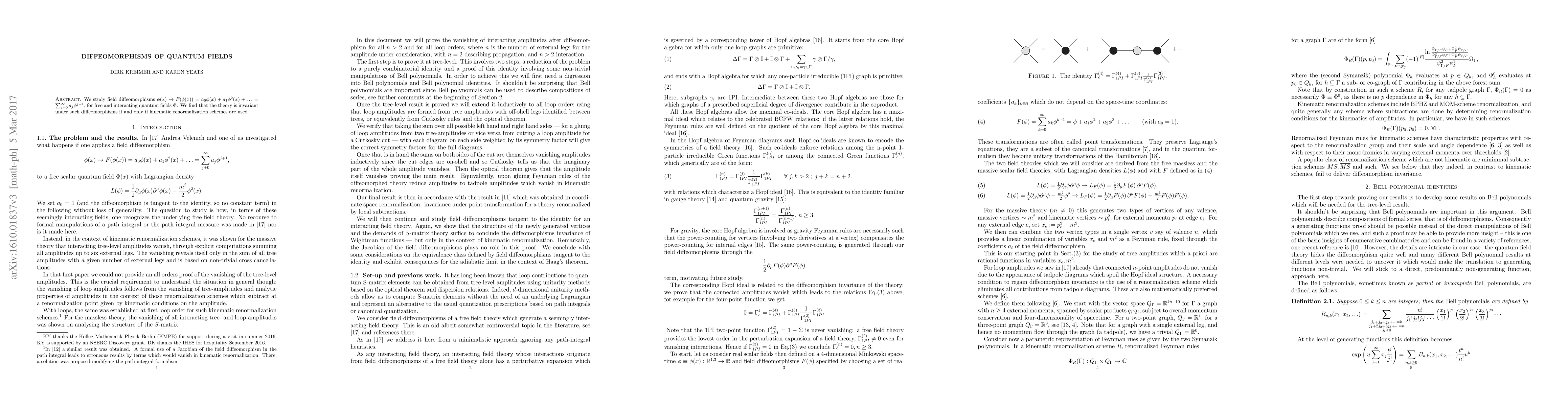 We study field diffeomorphisms $\Phi(x)= F(\rho(x))=a_0\rho(x)+a_1\rho^2(x)+\ldots=\sum_{j+0}^\infty a_j \rho^{j+1}$, for free and interacting quantum fields $\Phi$. We find that the theory is invariant under such diffeomorphisms if and only if kinematic renormalization schemes are used.