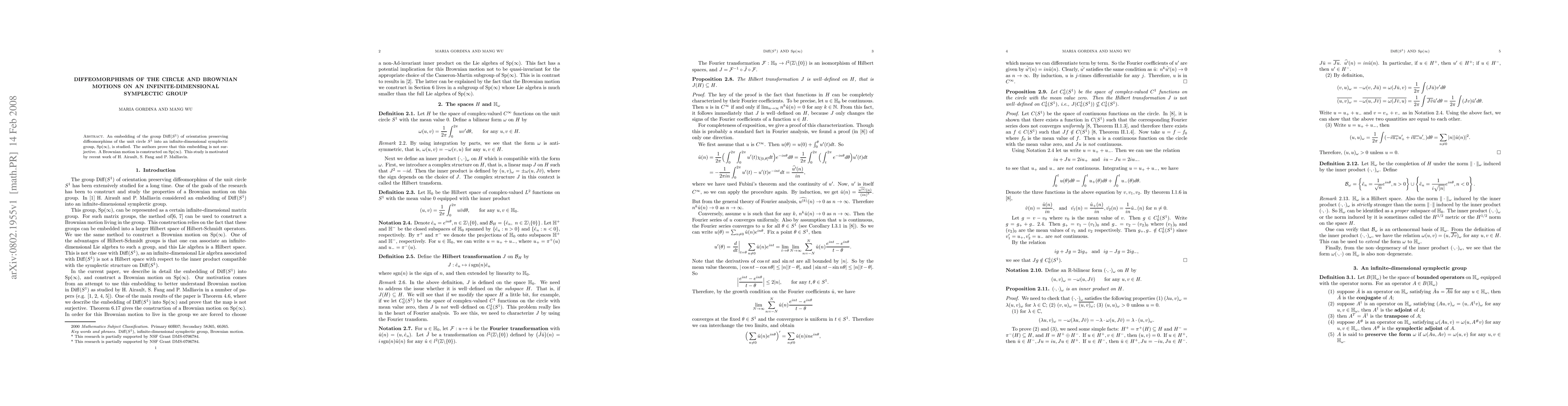 An embedding of the group $\Diff(S^{1})$ of orientation preserving diffeomorphims of the unit circle $S^1$ into an infinite-dimensional symplectic group, $\Sp(\infty)$, is studied. The authors prove that this embedding is not surjective. A Brownian motion is constructed on $\Sp(\infty)$. This study is motivated by recent work of H. Airault, S. Fang and P. Malliavin.