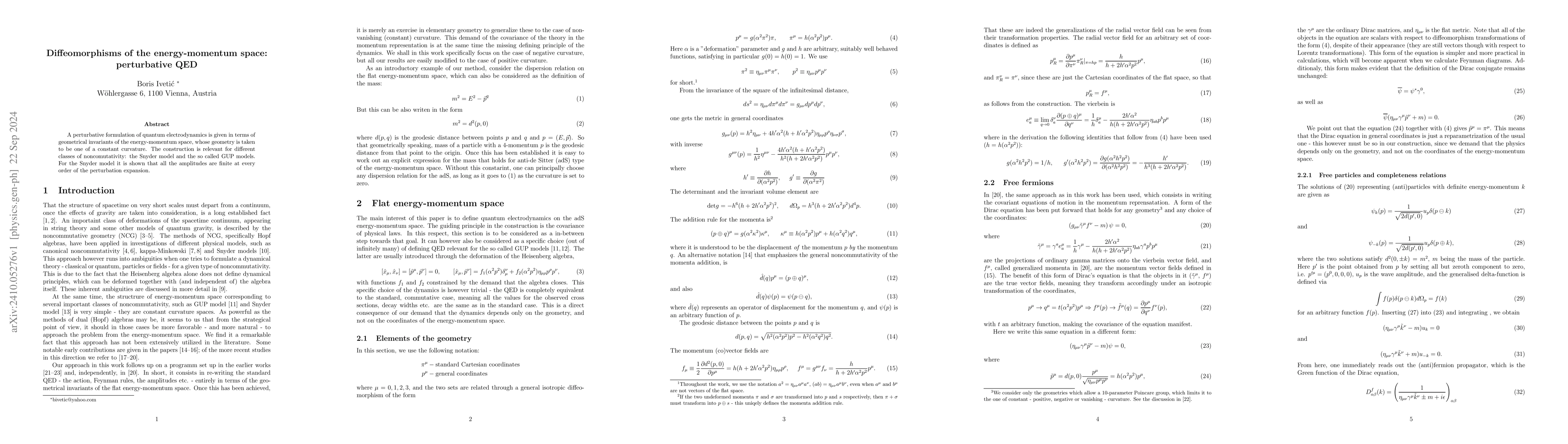 A perturbative formulation of quantum electrodynamics is given in terms of geometrical invariants of the energy-momentum space, whose geometry is taken to be one of a constant curvature. The construction is relevant for different classes of noncomutativity: the Snyder model and the so called GUP models. For the Snyder model it is shown that all the amplitudes are finite at every order of the perturbation expansion.