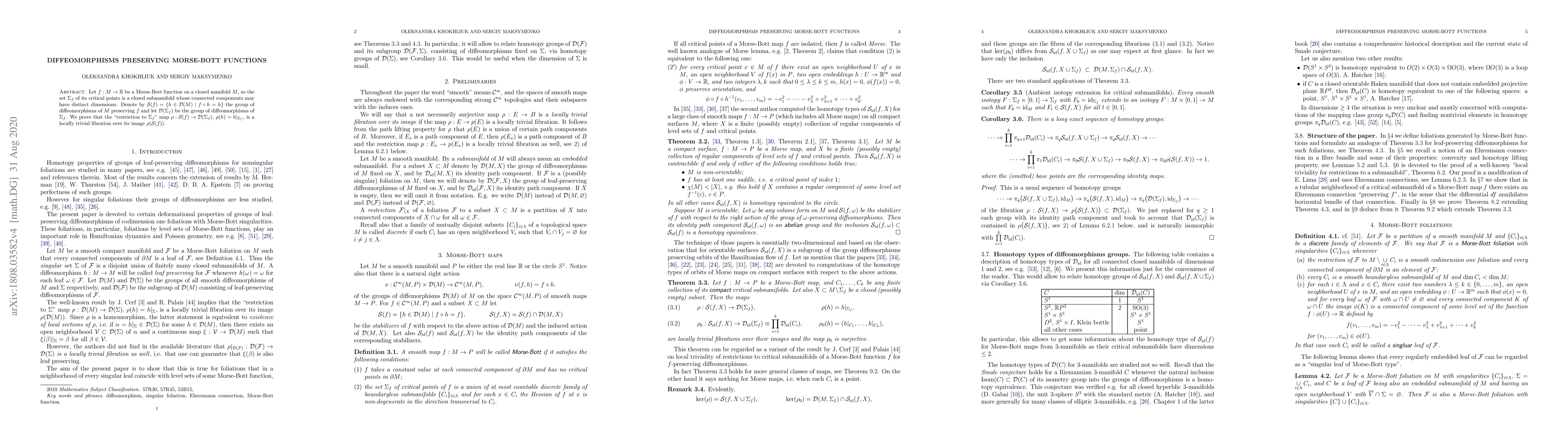 This paper studies diffeomorphisms preserving a Morse-Bott function on a closed manifold, proving that the restriction map from the group of preserving diffeomorphisms to the group of critical set diffeomorphisms is a locally trivial fibration over its image.