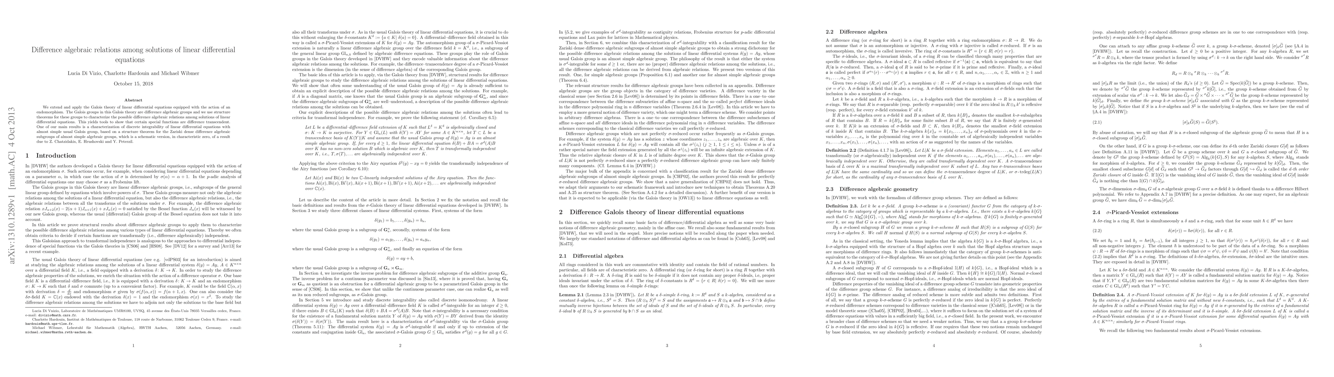 We extend and apply the Galois theory of linear differential equations equipped with the action of an endomorphism. The Galois groups in this Galois theory are difference algebraic groups and we use structure theorems for these groups to characterize the possible difference algebraic relations among solutions of linear differential equations. This yields tools to show that certain special functions are difference transcendent. One of our main results is a characterization of discrete integrability of linear differential equations with almost simple usual Galois group, based on a structure theorem for the Zariski dense difference algebraic subgroups of almost simple algebraic groups, which is a schematic version, in characteristic zero, of a result due to Z. Chatzidakis, E. Hrushovski and Y. Peterzil.