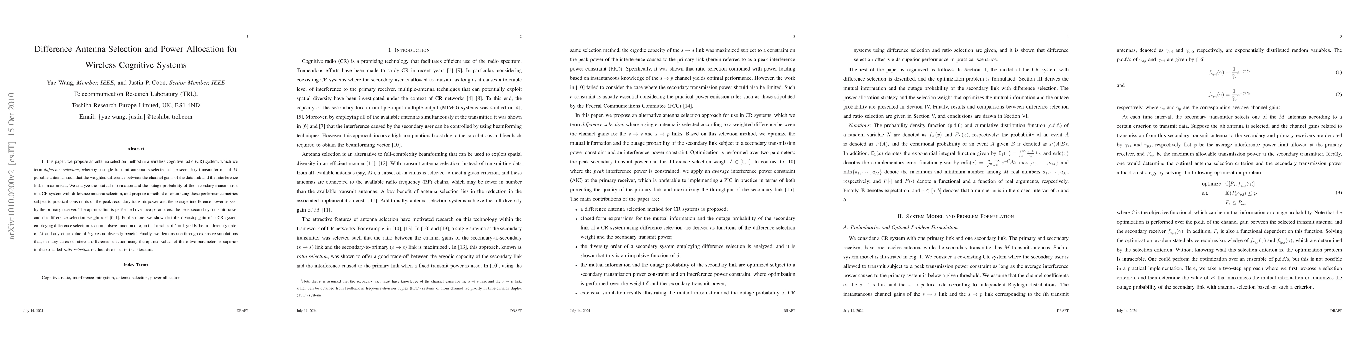 A new antenna selection method called 'difference selection' improves wireless cognitive radio system performance by maximizing channel gain difference between data and interference links. This approach outperforms traditional ratio selection in some cases, especially when power constraints are applied.