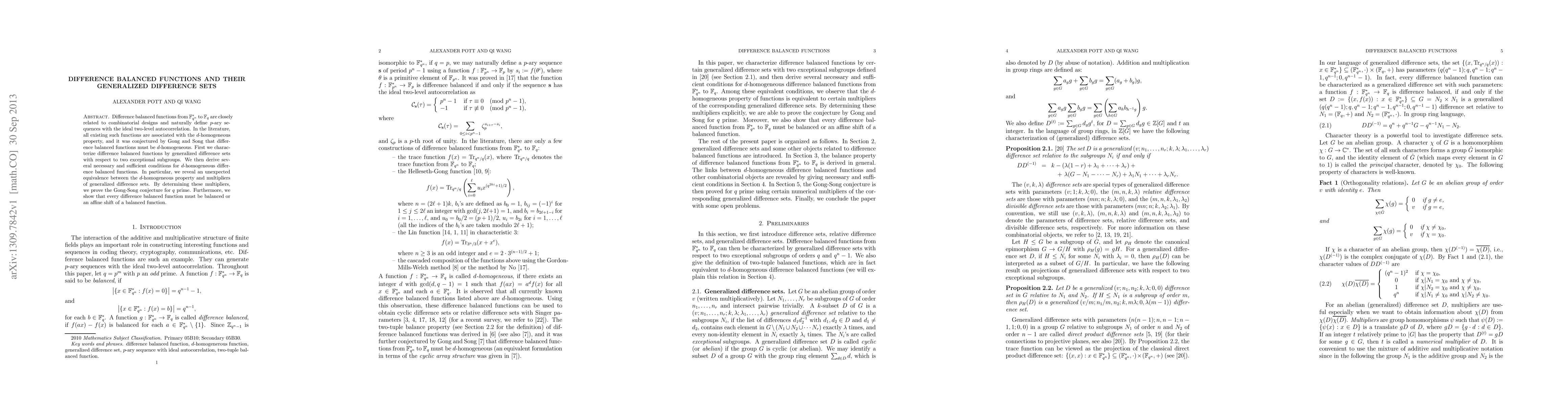 Difference balanced functions from $F_{q^n}^*$ to $F_q$ are closely related to combinatorial designs and naturally define $p$-ary sequences with the ideal two-level autocorrelation. In the literature, all existing such functions are associated with the $d$-homogeneous property, and it was conjectured by Gong and Song that difference balanced functions must be $d$-homogeneous. First we characterize difference balanced functions by generalized difference sets with respect to two exceptional subgroups. We then derive several necessary and sufficient conditions for $d$-homogeneous difference balanced functions. In particular, we reveal an unexpected equivalence between the $d$-homogeneous property and multipliers of generalized difference sets. By determining these multipliers, we prove the Gong-Song conjecture for $q$ prime. Furthermore, we show that every difference balanced function must be balanced or an affine shift of a balanced function.