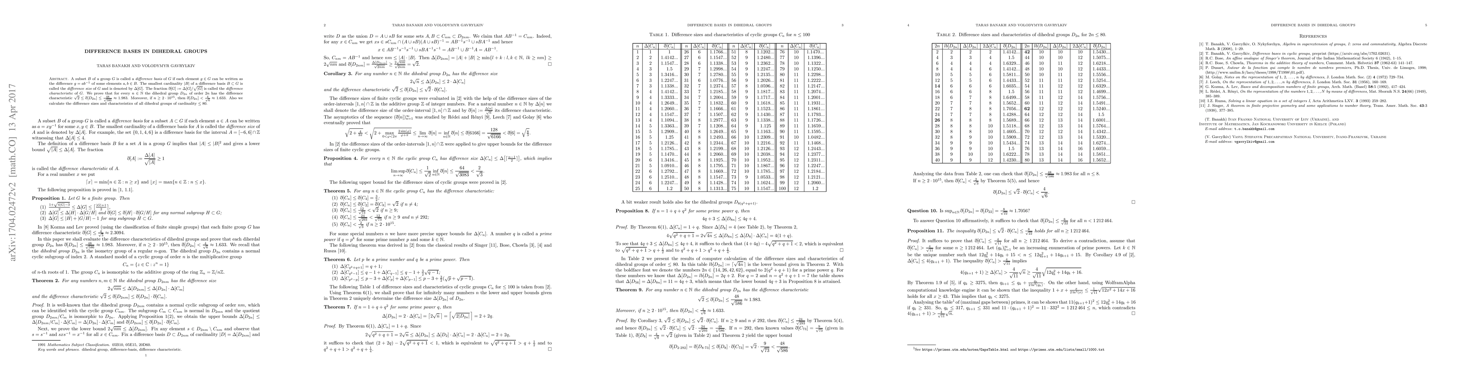 This paper investigates difference bases in dihedral groups, proving that the dihedral group $D_{2n}$ has a difference characteristic $\eth[D_{2n}]$ bounded between $\sqrt{2}$ and $\frac{48}{\sqrt{586}}$, and specifically less than $\frac{4}{\sqrt{6}}$ for $n\ge 2\cdot 10^{15}$. It also computes the difference sizes and characteristics for all dihedral groups of order up to 80.