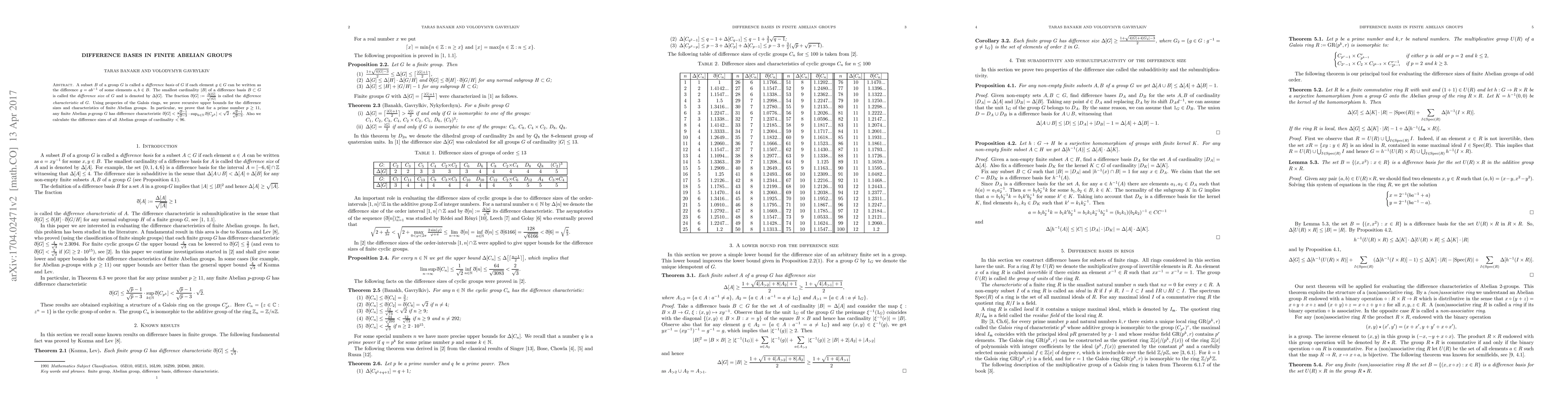 This paper explores the concept of difference bases in finite Abelian groups, establishing recursive upper bounds for their difference sizes and characteristics. It specifically finds that for primes $p\geq 11$, the difference characteristic of any finite Abelian $p$-group is less than $\sqrt{2}\cdot\frac{\sqrt{p}-1}{\sqrt{p}-3}$.