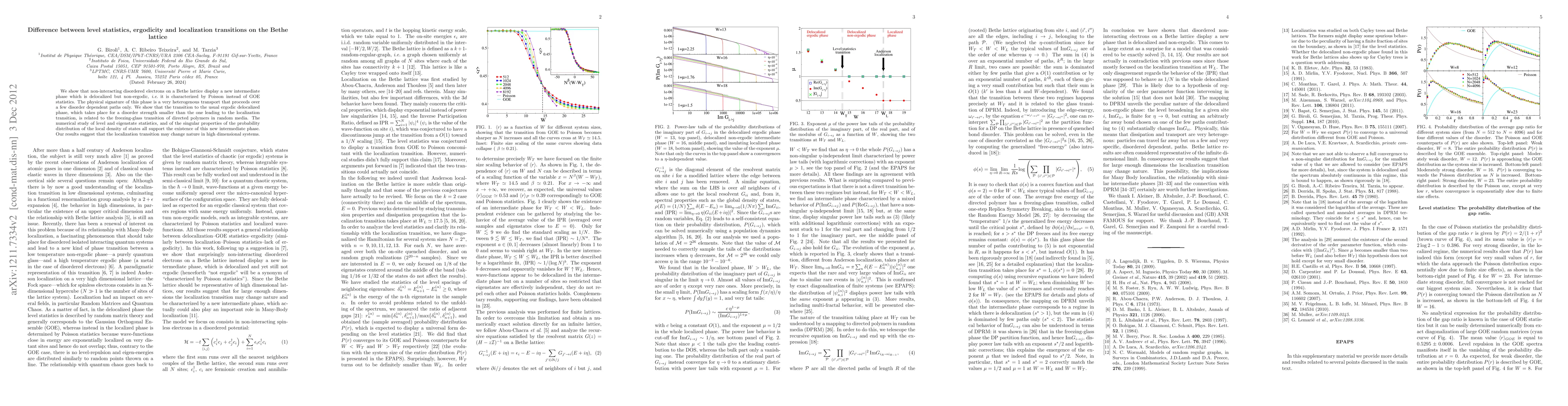 This paper identifies a new intermediate phase in non-interacting disordered electrons on a Bethe lattice, characterized by delocalized but non-ergodic behavior with Poisson statistics, contrasting with the usual ergodic phase. The transition to this phase is linked to the freezing-glass transition of directed polymers in random media.