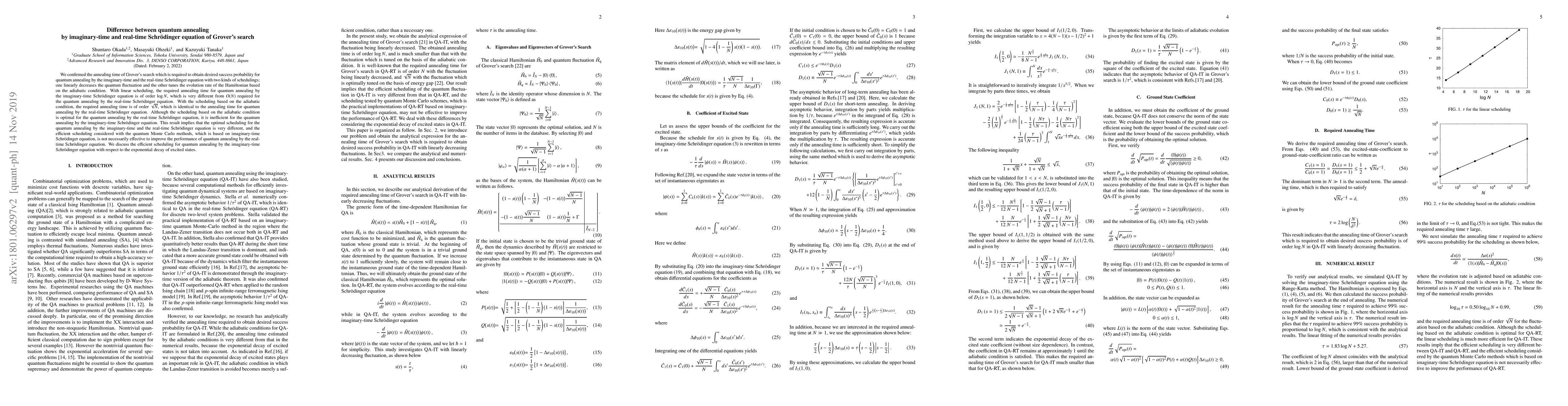 This paper investigates the difference in annealing times for Grover's search using quantum annealing via imaginary-time versus real-time Schrödinger equations. It finds that linear scheduling yields $\log N$ annealing time for imaginary-time, contrasting with the $O(N)$ for real-time, while adiabatic-based scheduling achieves $\sqrt{N}$ for both, though it is inefficient for imaginary-time.