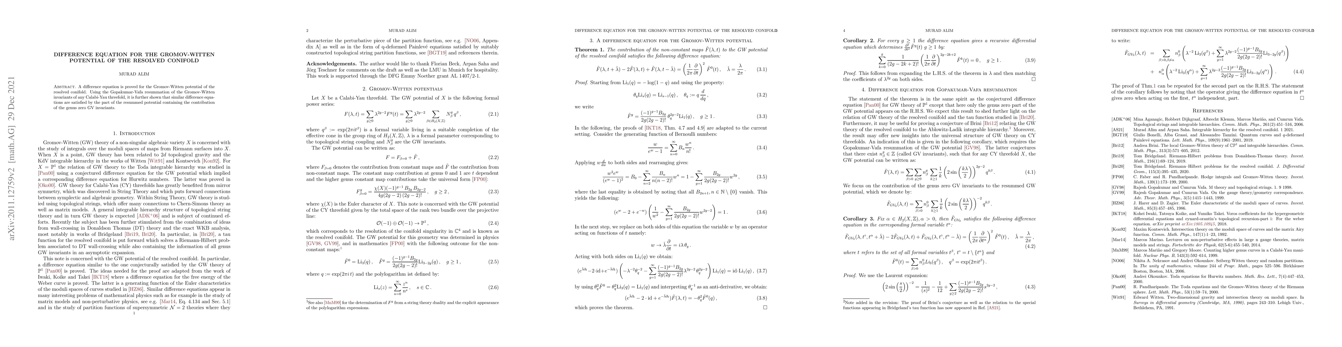 Summary: The paper establishes a difference equation for the Gromov-Witten potential of the resolved conifold and demonstrates that a similar equation holds for the resummed potential involving genus zero Gopakumar-Vafa invariants.