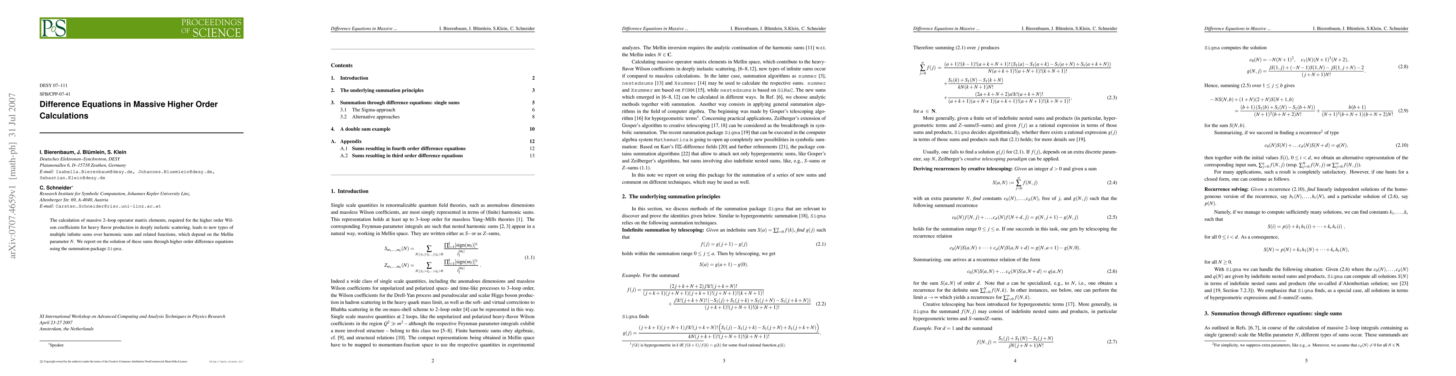 The paper presents an innovative approach using difference equations and the Sigma summation package to solve complex infinite sums over harmonic sums and related functions in massive higher-order calculations.