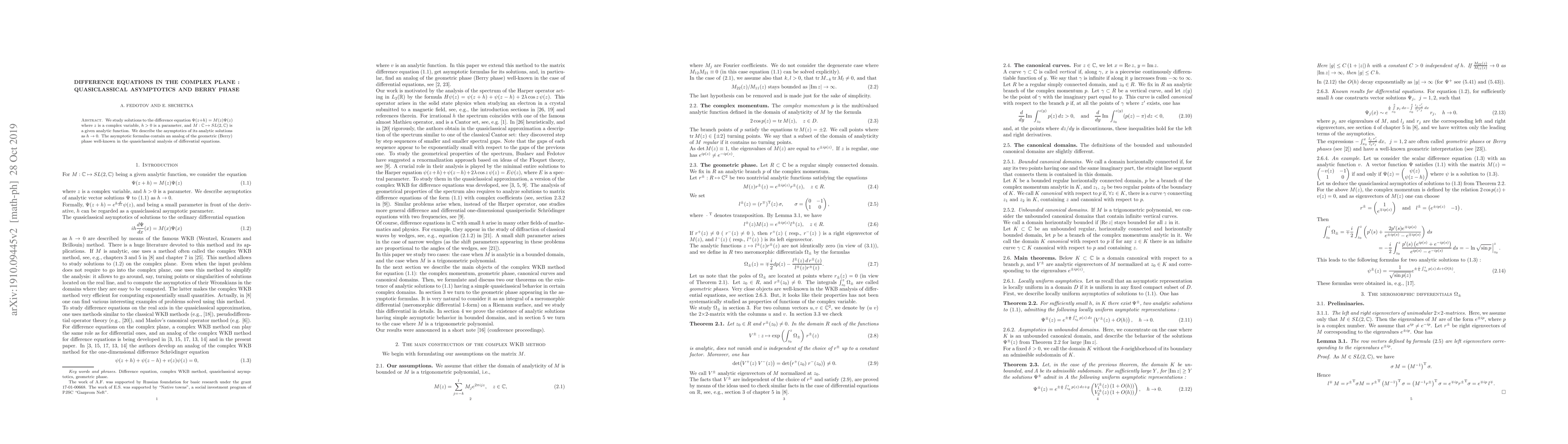 We study solutions to the difference equation $\Psi(z+h)=M(z)\Psi(z)$ where $z$ is a complex variable, $h>0$ is a parameter, and $M:\mathbb{C}\mapsto SL(2,\mathbb{C})$ is a given analytic function. We describe the asymptotics of its analytic solutions as $h\to 0$. The asymptotic formulas contain an analog of the geometric (Berry) phase well-known in the quasiclassical analysis of differential equations.