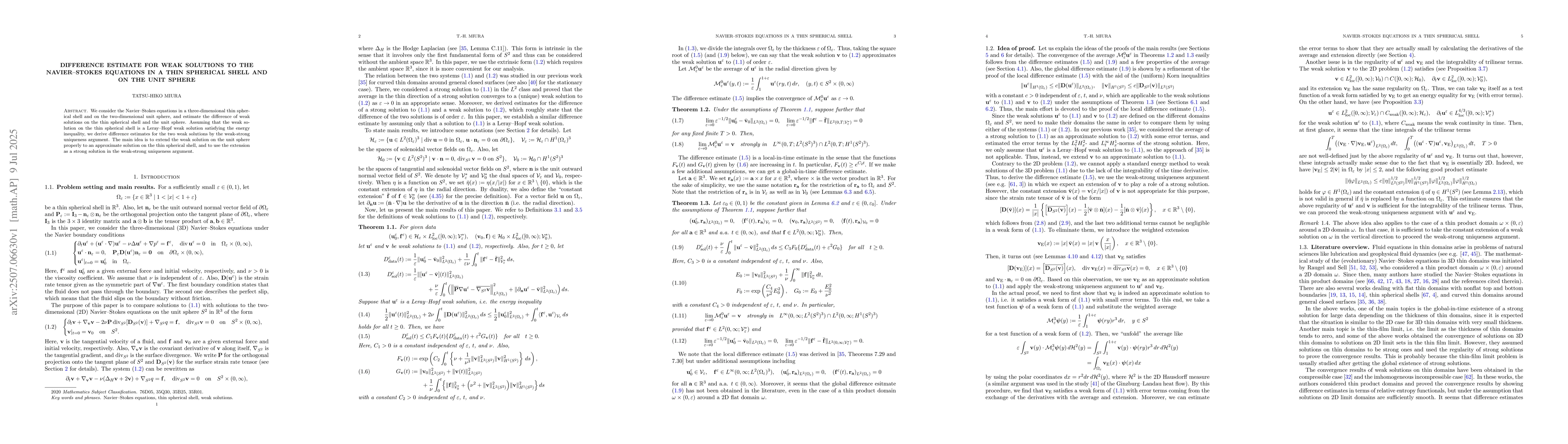 We consider the Navier-Stokes equations in a three-dimensional thin spherical shell and on the two-dimensional unit sphere, and estimate the difference of weak solutions on the thin spherical shell and the unit sphere. Assuming that the weak solution on the thin spherical shell is a Leray-Hopf weak solution satisfying the energy inequality, we derive difference estimates for the two weak solutions by the weak-strong uniqueness argument. The main idea is to extend the weak solution on the unit sphere properly to an approximate solution on the thin spherical shell, and to use the extension as a strong solution in the weak-strong uniqueness argument.