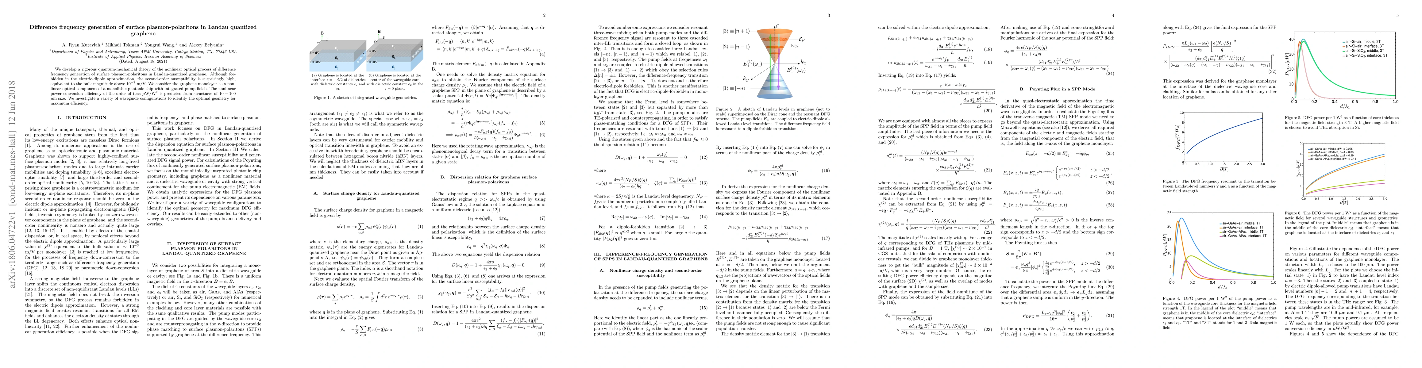 We develop a rigorous quantum-mechanical theory of the nonlinear optical process of difference frequency generation of surface plasmon-polaritons in Landau-quantized graphene. Although forbidden in the electric-dipole approximation, the second-order susceptibility is surprisingly high, equivalent to the bulk magnitude above $10^{-3}$ m/V. We consider the graphene monolayer as a nonlinear optical component of a monolithic photonic chip with integrated pump fields. The nonlinear power conversion efficiency of the order of tens $\mu$W/W$^2$ is predicted from structures of $10-100$ $\mu$m size. We investigate a variety of waveguide configurations to identify the optimal geometry for maximum efficiency.