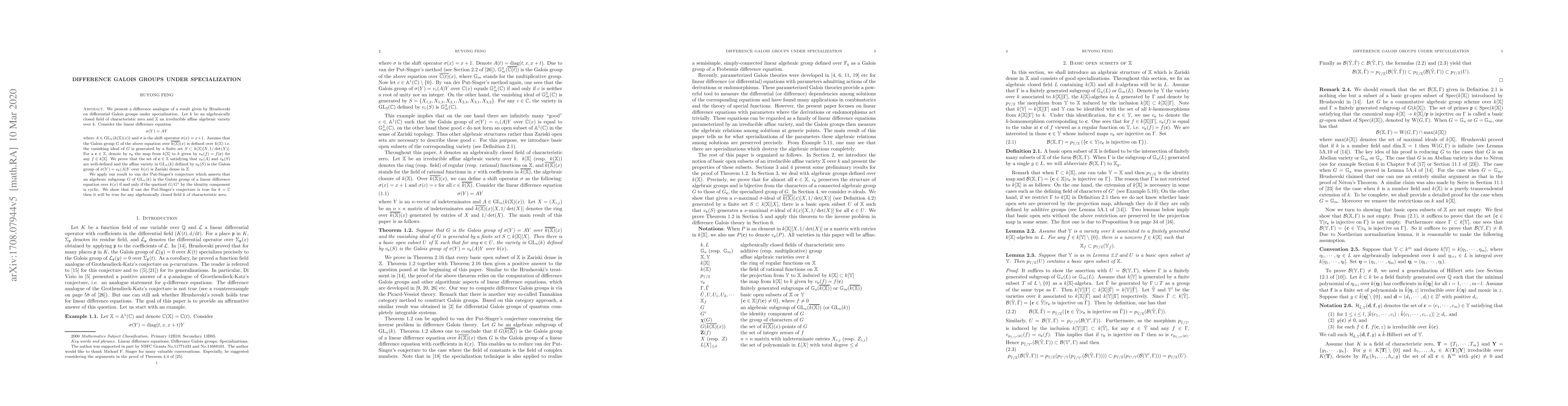 We present a difference analogue of a result given by Hrushovski on differential Galois groups under specialization. Let $k$ be an algebraically closed field of characteristic zero and $\mathbb{X}$ an irreducible affine algebraic variety over $k$. Consider the linear difference equation $$ \sigma(Y)=AY $$ where $A\in \mathrm{GL}_n(k(\mathbb{X})(x))$ and $\sigma$ is the shift operator $\sigma(x)=x+1$. Assume that the Galois group $G$ of the above equation over $\overline{k(\mathbb{X})}(x)$ is defined over $k(\mathbb{X})$ i.e. the vanishing ideal of $G$ is generated by a finite set $S\subset k(\mathbb{X})[X,1/\det(X)]$. For a ${\bf c}\in \mathbb{X}$, denote by $v_{\bf c}$ the map from $k[\mathbb{X}]$ to $k$ given by $v_{\bf c}(f)=f({\bf c})$ for any $f\in k[\mathbb{X}]$. We prove that the set of ${\bf c}\in \mathbb{X}$ satisfying that $v_{\bf c}(A)$ and $v_{\bf c}(S)$ are well-defined and the affine variety in $\mathrm{GL}_n(k)$ defined by $v_{\bf c}(S)$ is the Galois group of $\sigma(Y)=v_{\bf c}(A)Y$ over $k(x)$ is Zariski dense in $\mathbb{X}$. We apply our result to van der Put-Singer's conjecture which asserts that an algebraic subgroup $G$ of $\mathrm{GL}_n(k)$ is the Galois group of a linear difference equation over $k(x)$ if and only if the quotient $G/G^\circ$ by the identity component is cyclic. We show that if van der Put-Singer's conjecture is true for $k=\mathbb{C}$ then it will be true for any algebraically closed field $k$ of characteristic zero.