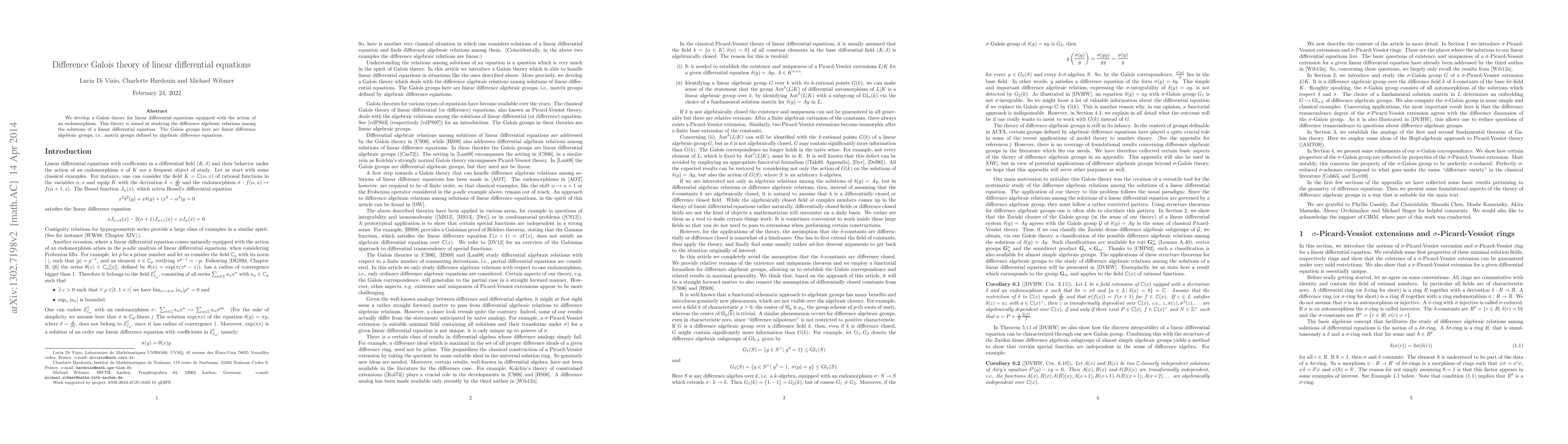 Summary: This paper develops a Galois theory for linear differential equations with endomorphism actions, focusing on difference algebraic relations among solutions. The theory introduces linear difference algebraic groups as Galois groups.