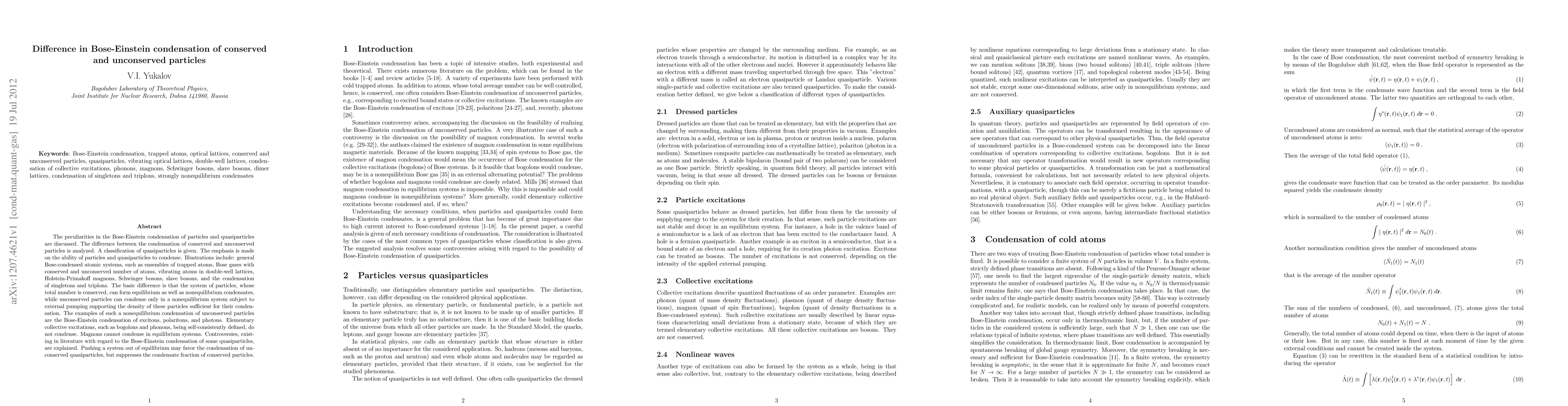 The peculiarities in the Bose-Einstein condensation of particles and quasiparticles are discussed. The difference between the condensation of conserved and unconserved particles is analyzed. A classification of quasiparticles is given. The emphasis is made on the ability of particles and quasiparticles to condense. Illustrations include: general Bose-condensed atomic systems, such as ensembles of trapped atoms, Bose gases with conserved and unconserved number of atoms, vibrating atoms in double-well lattices, Holstein-Primakoff magnons, Schwinger bosons, slave bosons, and the condensation of singletons and triplons. The basic difference is that the system of particles, whose total number is conserved, can form equilibrium as well as nonequilibrium condensates, while unconserved particles can condense only in a nonequilibrium system subject to external pumping supporting the density of these particles sufficient for their condensation. The examples of such a nonequilibrium condensation of unconserved particles are the Bose-Einstein condensation of excitons, polaritons, and photons. Elementary collective excitations, such as bogolons and phonons, being self-consistently defined, do not condense. Magnons cannot condense in equilibrium systems. Controversies, existing in literature with regard to the Bose-Einstein condensation of some quasiparticles, are explained. Pushing a system out of equilibrium may favor the condensation of unconserved quasiparticles, but suppresses the condensate fraction of conserved particles.
