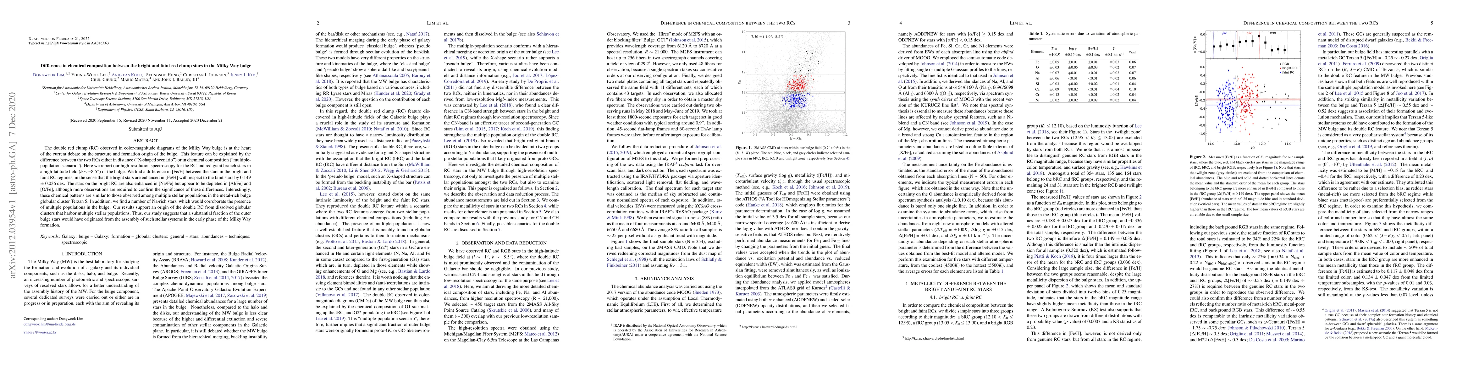 This study reveals a chemical composition difference between the bright and faint red clump stars in the Milky Way bulge, indicating that bright stars are more metal-rich and show distinct patterns in [Na/Fe], [Al/Fe], and [O/Fe] ratios. These findings support the "multiple-population scenario" and suggest that the double red clump originates from dissolved globular clusters with multiple stellar populations.