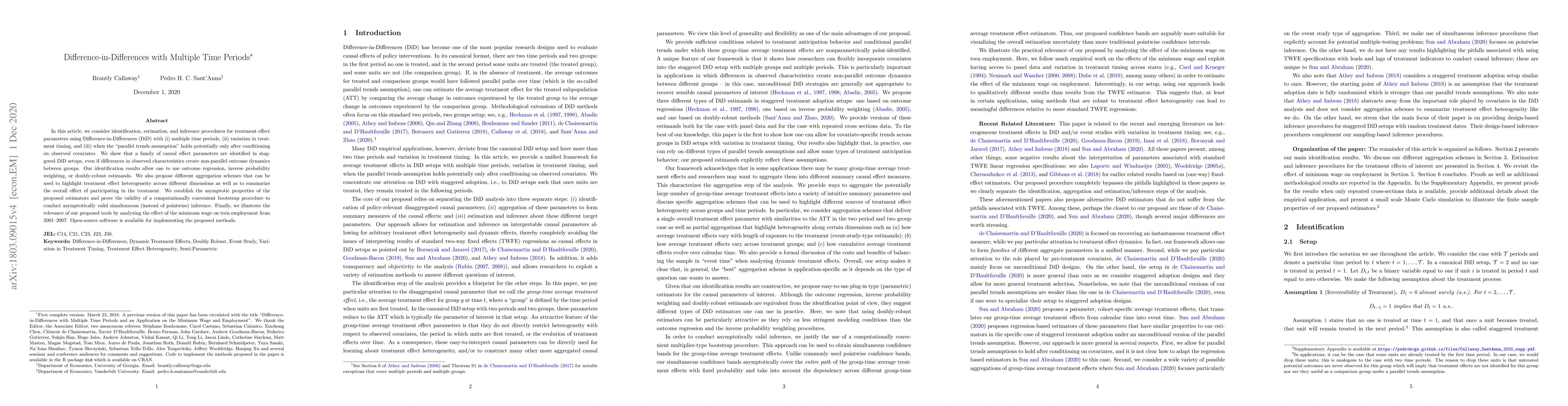 In this article, we consider identification, estimation, and inference procedures for treatment effect parameters using Difference-in-Differences (DiD) with (i) multiple time periods, (ii) variation in treatment timing, and (iii) when the "parallel trends assumption" holds potentially only after conditioning on observed covariates. We show that a family of causal effect parameters are identified in staggered DiD setups, even if differences in observed characteristics create non-parallel outcome dynamics between groups. Our identification results allow one to use outcome regression, inverse probability weighting, or doubly-robust estimands. We also propose different aggregation schemes that can be used to highlight treatment effect heterogeneity across different dimensions as well as to summarize the overall effect of participating in the treatment. We establish the asymptotic properties of the proposed estimators and prove the validity of a computationally convenient bootstrap procedure to conduct asymptotically valid simultaneous (instead of pointwise) inference. Finally, we illustrate the relevance of our proposed tools by analyzing the effect of the minimum wage on teen employment from 2001--2007. Open-source software is available for implementing the proposed methods.