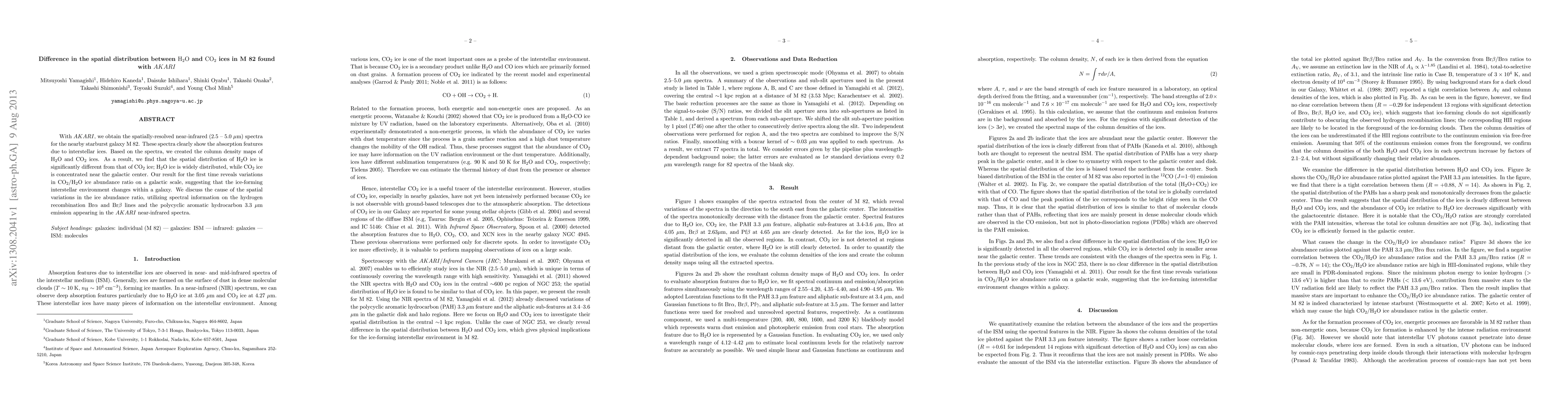 This study using AKARI reveals distinct spatial distributions of H_2O and CO_2 ices in M82, with H_2O ice being widespread and CO_2 ice concentrated near the galactic center, indicating variations in the ice abundance ratio on a galactic scale.