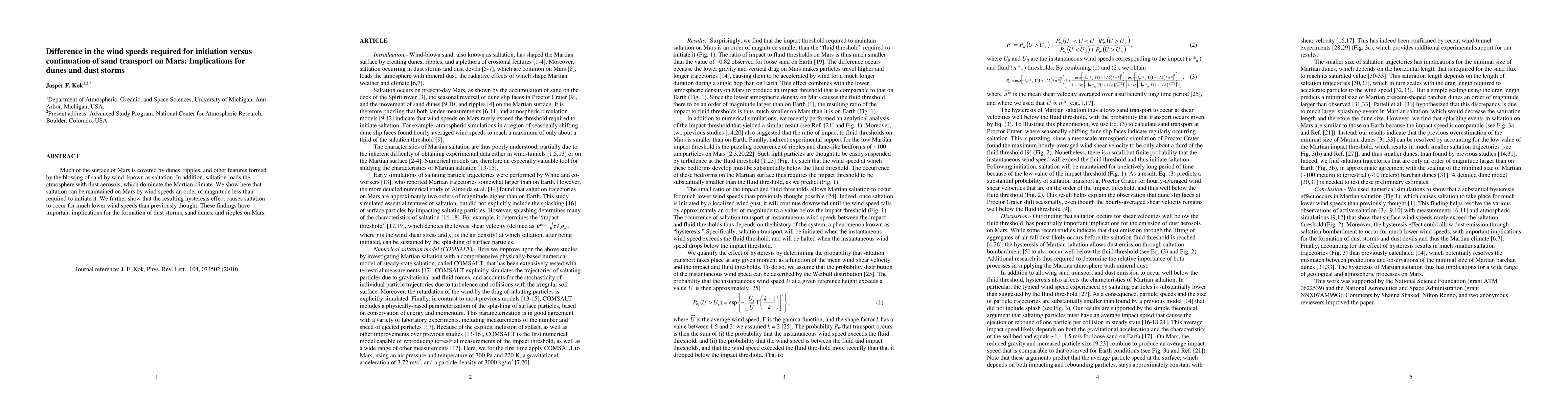 This study reveals that maintaining sand transport on Mars requires wind speeds an order of magnitude lower than those needed to initiate it, leading to a significant hysteresis effect. These findings have crucial implications for understanding the formation of Martian dunes and dust storms.