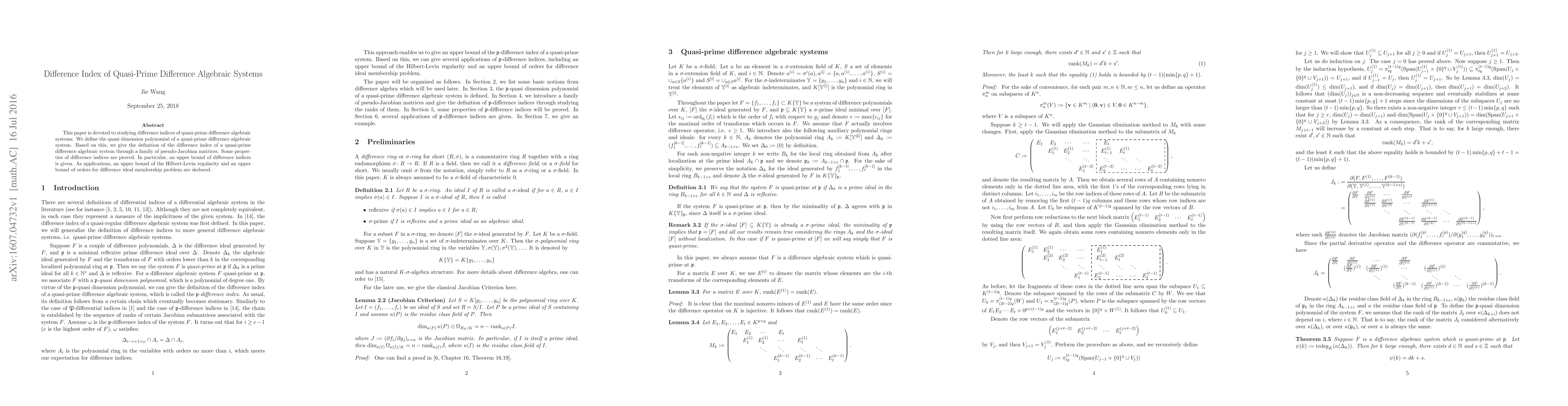 This paper defines the difference index of quasi-prime difference algebraic systems using quasi dimension polynomials and pseudo-Jacobian matrices, proving its properties and establishing an upper bound. Applications include bounds for Hilbert-Levin regularity and the difference ideal membership problem.