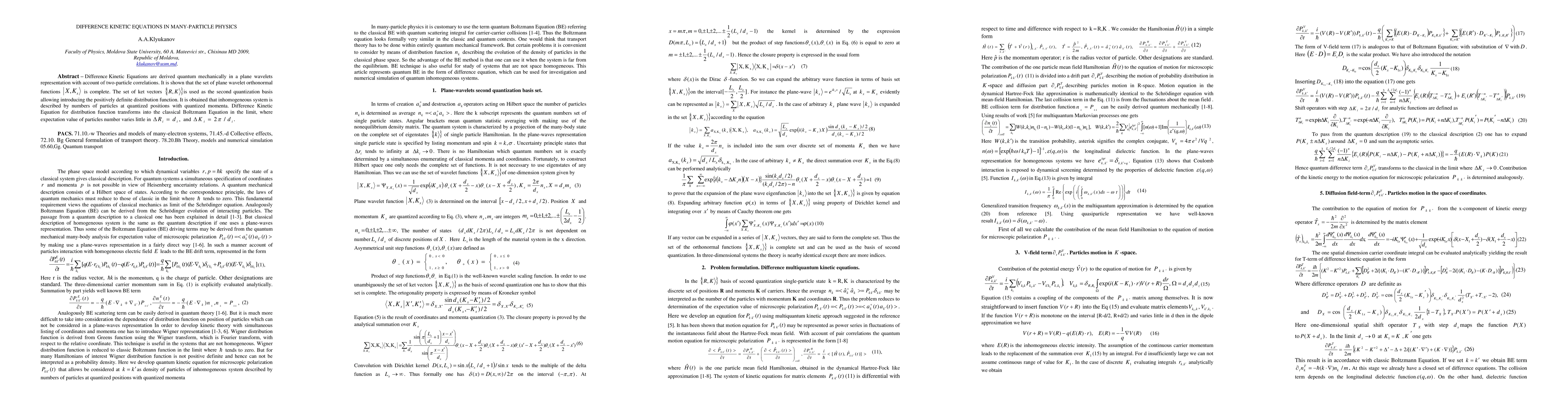 Difference Kinetic Equations are derived quantum mechanically in a plane wavelets representation with account of two-particle correlations. It is shown that the set of plane wavelet orthonormal functions is complete. The set of ket vectors is used as the second quantization basis allowing introducing the positively definite distribution function. It is obtained that inhomogeneous system is described by numbers of particles at quantized positions with quantized momenta. Difference Kinetic Equation for distribution function transforms into the classical Boltzmann Equation in the limit, where expectation value of particles number varies little.