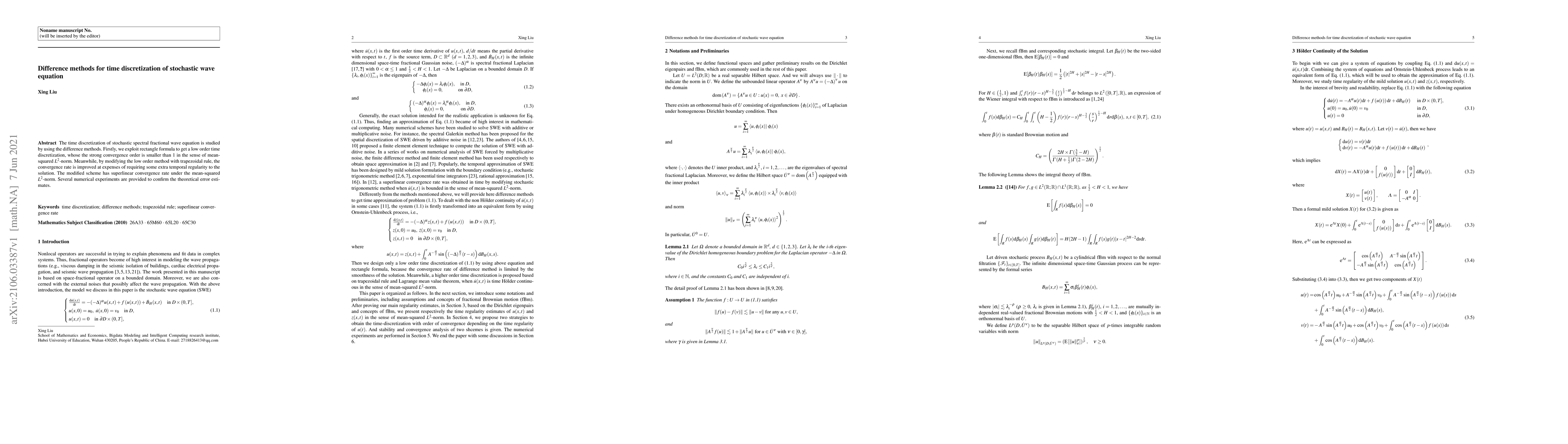 The time discretization of stochastic spectral fractional wave equation is studied by using the difference methods. Firstly, we exploit rectangle formula to get a low order time discretization, whose the strong convergence order is smaller than $1$ in the sense of mean-squared $L^2$-norm. Meanwhile, by modifying the low order method with trapezoidal rule, the convergence rate is improved at expenses of requiring some extra temporal regularity to the solution. The modified scheme has superlinear convergence rate under the mean-squared $L^2$-norm. Several numerical experiments are provided to confirm the theoretical error estimates.