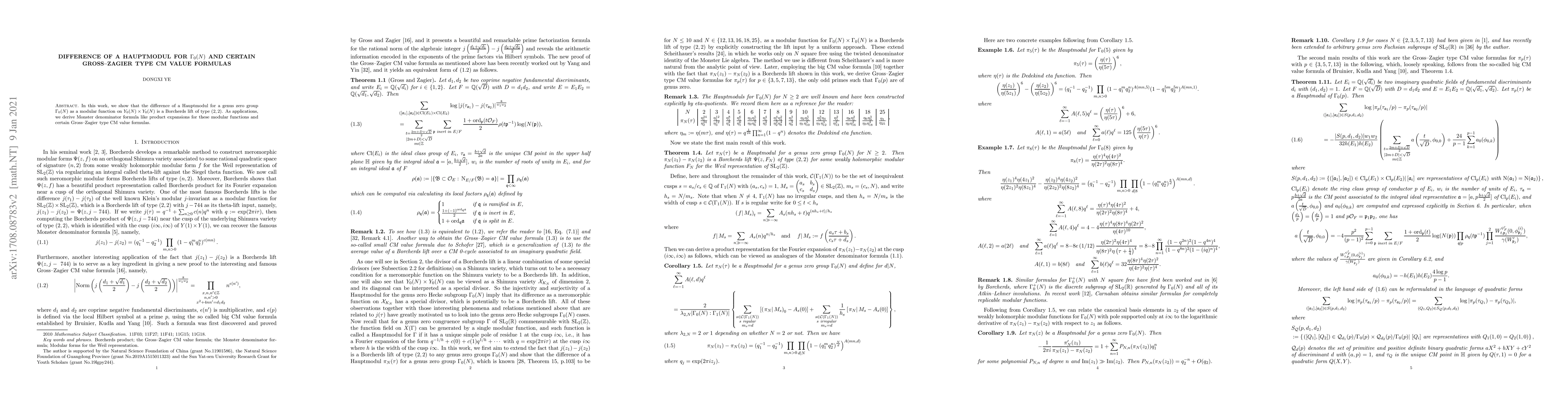This paper demonstrates that the difference of a Hauptmodul for $\Gamma_{0}(N)$ is a Borcherds lift of type $(2,2)$, and applies this to derive Monster denominator formula-like expansions for these Hilbert modular functions and Gross-Zagier type CM value formulas.