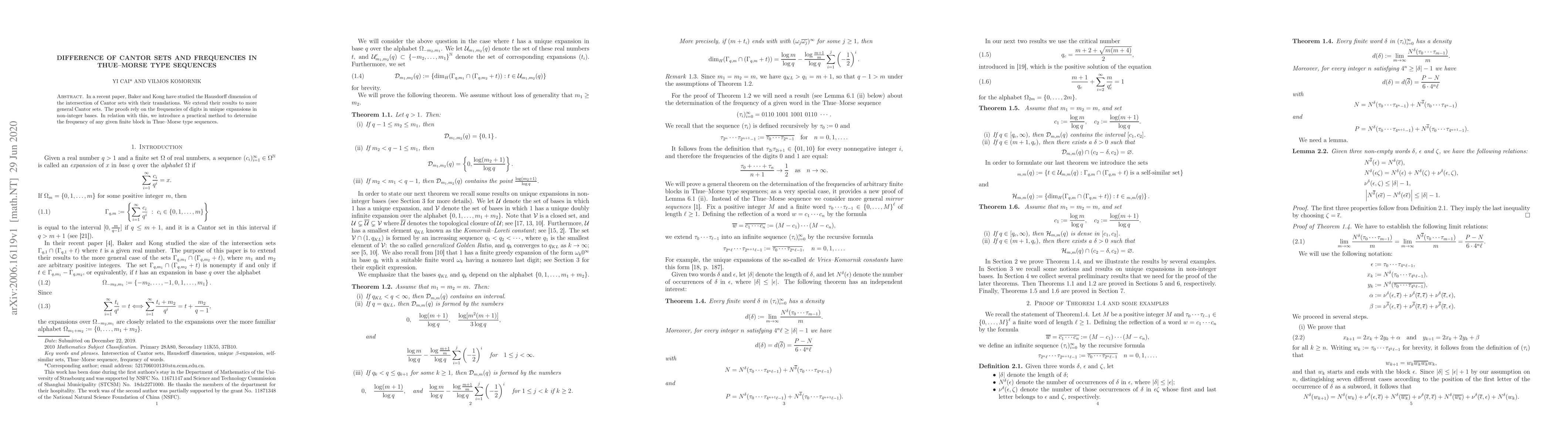 This paper extends the study of Hausdorff dimensions for intersections of Cantor sets and their translations to more general Cantor sets, utilizing digit frequencies in non-integer bases. It also introduces a method for determining the frequency of finite blocks in Thue-Morse type sequences.