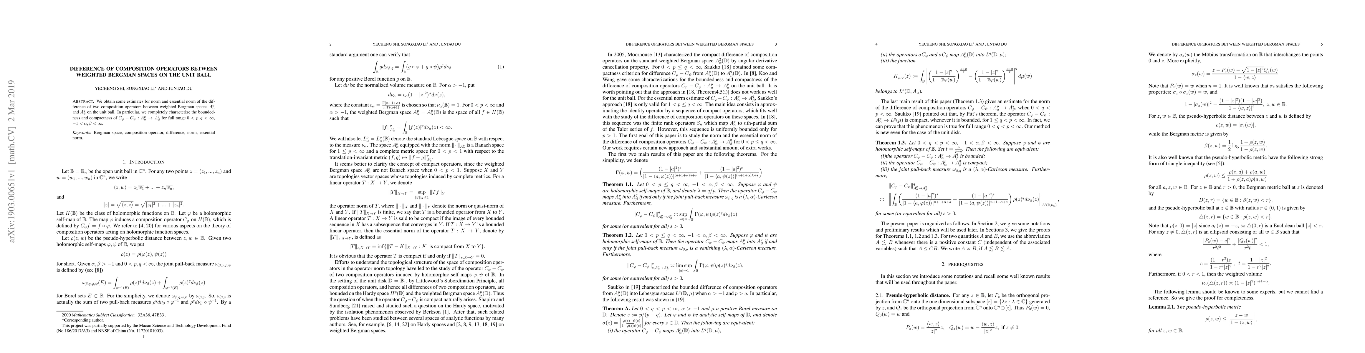 Summary: The paper provides estimates for the norm and essential norm of the difference between two composition operators in weighted Bergman spaces on the unit ball, fully characterizing their boundedness and compactness across a broad range of parameters.