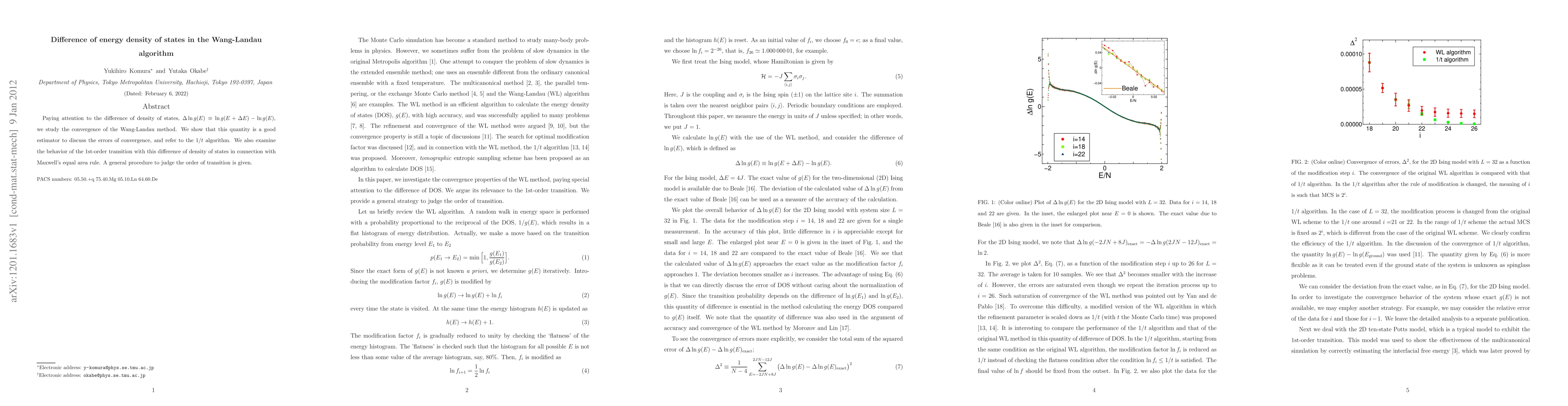 Paying attention to the difference of density of states, \Delta ln g(E) = ln g(E+\Delta E) - ln g(E), we study the convergence of the Wang-Landau method. We show that this quantity is a good estimator to discuss the errors of convergence, and refer to the $1/t$ algorithm. We also examine the behavior of the 1st-order transition with this difference of density of states in connection with Maxwell's equal area rule. A general procedure to judge the order of transition is given.