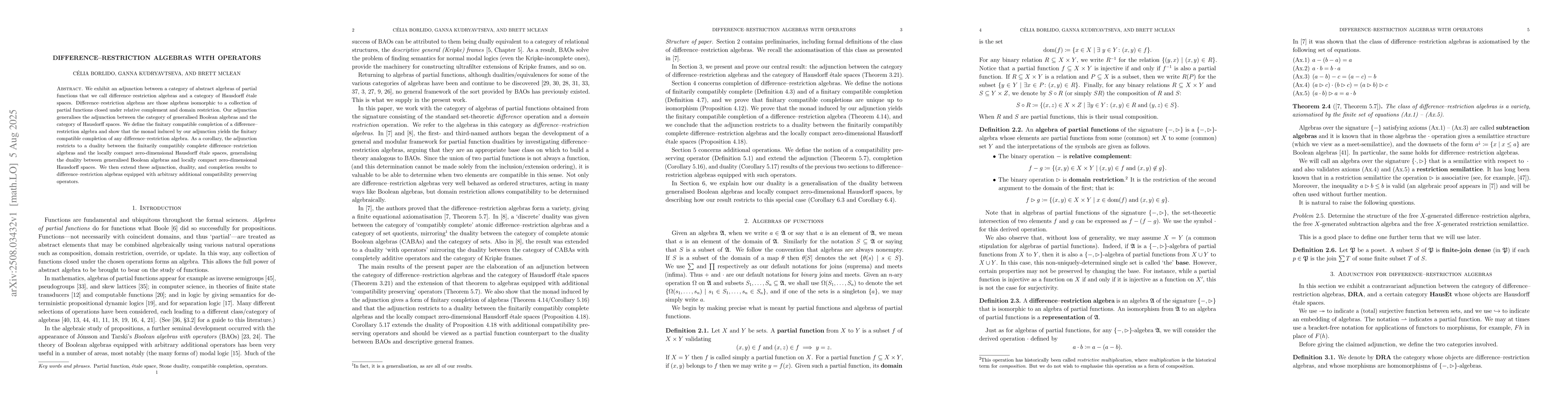 We exhibit an adjunction between a category of abstract algebras of partial functions that we call difference-restriction algebras and a category of Hausdorff \'etale spaces. Difference-restriction algebras are those algebras isomorphic to a collection of partial functions closed under relative complement and domain restriction. Our adjunction generalises the adjunction between the category of generalised Boolean algebras and the category of Hausdorff spaces. We define the finitary compatible completion of a difference-restriction algebra and show that the monad induced by our adjunction yields the finitary compatible completion of any difference-restriction algebra. As a corollary, the adjunction restricts to a duality between the finitarily compatibly complete difference-restriction algebras and the locally compact zero-dimensional Hausdorff \'etale spaces, generalising the duality between generalised Boolean algebras and locally compact zero-dimensional Hausdorff spaces. We then extend these adjunction, duality, and completion results to difference-restriction algebras equipped with arbitrary additional compatibility preserving operators.