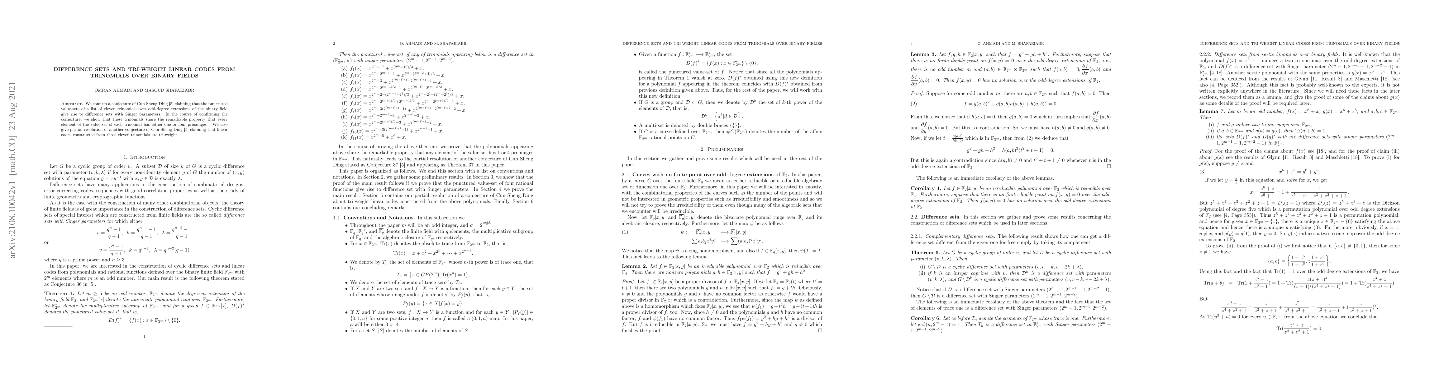 Research confirms a conjecture about trinomials over binary fields producing difference sets with specific parameters, and also shows these trinomials have unique preimage properties that lead to tri-weight linear codes.