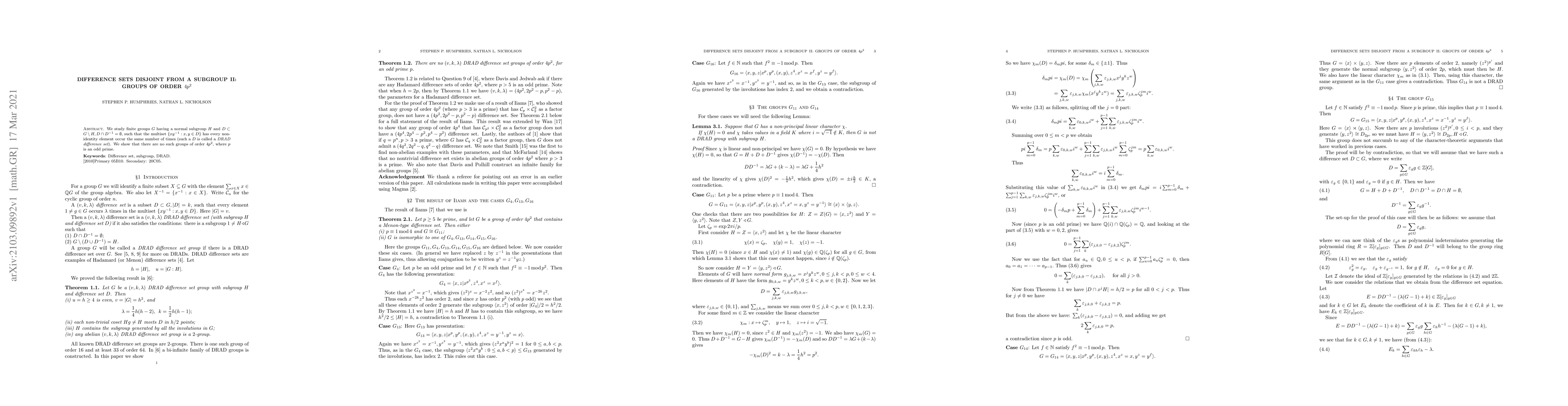 We study finite groups $G$ having a normal subgroup $H$ and $D \subset G \setminus H, D \cap D^{-1}=\emptyset,$ such that the multiset $\{ xy^{-1}:x,y \in D\}$ has every non-identity element occur the same number of times (such a $D$ is called a {\it DRAD difference set}). We show that there are no such groups of order $4p^2$, where $p$ is an odd prime.