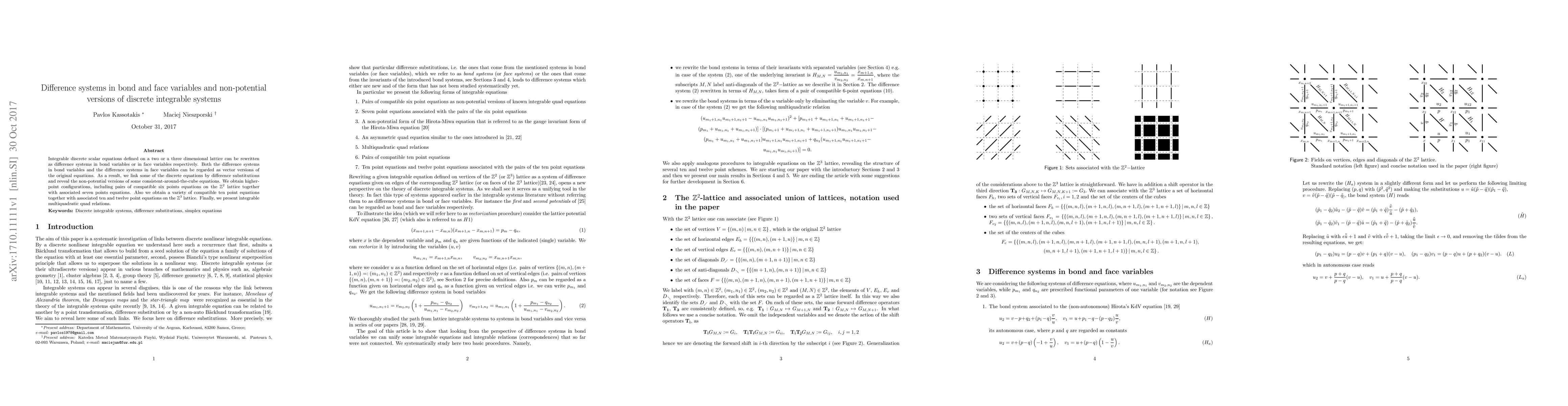 This paper explores the reformulation of integrable discrete scalar equations on lattices as difference systems in bond or face variables, revealing non-potential versions of these systems. It establishes connections between various discrete equations through difference substitutions and presents higher-point configurations and multiquadratic quad relations.