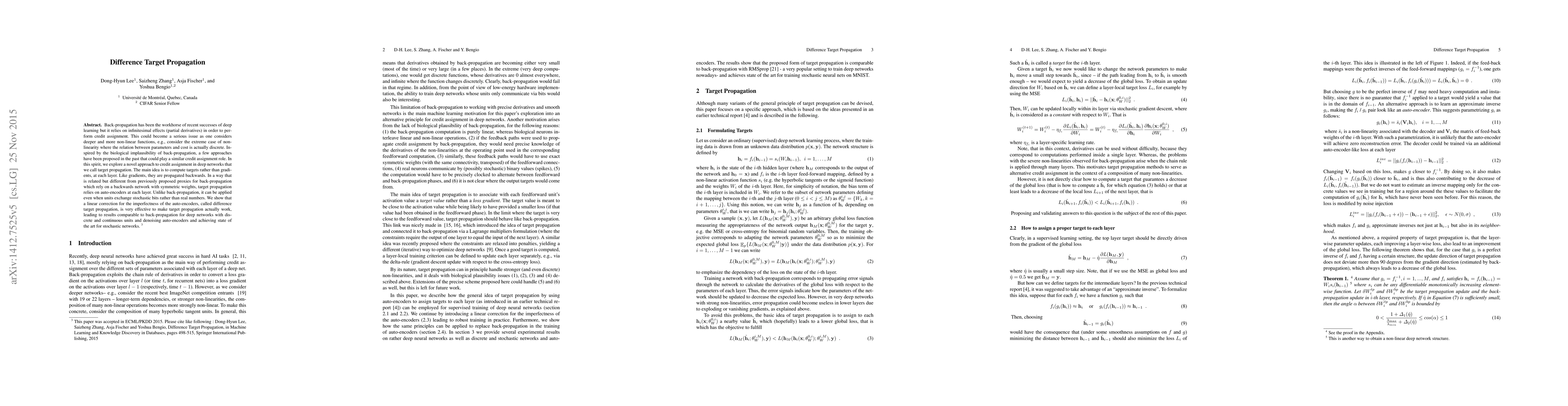 Back-propagation has been the workhorse of recent successes of deep learning but it relies on infinitesimal effects (partial derivatives) in order to perform credit assignment. This could become a serious issue as one considers deeper and more non-linear functions, e.g., consider the extreme case of nonlinearity where the relation between parameters and cost is actually discrete. Inspired by the biological implausibility of back-propagation, a few approaches have been proposed in the past that could play a similar credit assignment role. In this spirit, we explore a novel approach to credit assignment in deep networks that we call target propagation. The main idea is to compute targets rather than gradients, at each layer. Like gradients, they are propagated backwards. In a way that is related but different from previously proposed proxies for back-propagation which rely on a backwards network with symmetric weights, target propagation relies on auto-encoders at each layer. Unlike back-propagation, it can be applied even when units exchange stochastic bits rather than real numbers. We show that a linear correction for the imperfectness of the auto-encoders, called difference target propagation, is very effective to make target propagation actually work, leading to results comparable to back-propagation for deep networks with discrete and continuous units and denoising auto-encoders and achieving state of the art for stochastic networks.