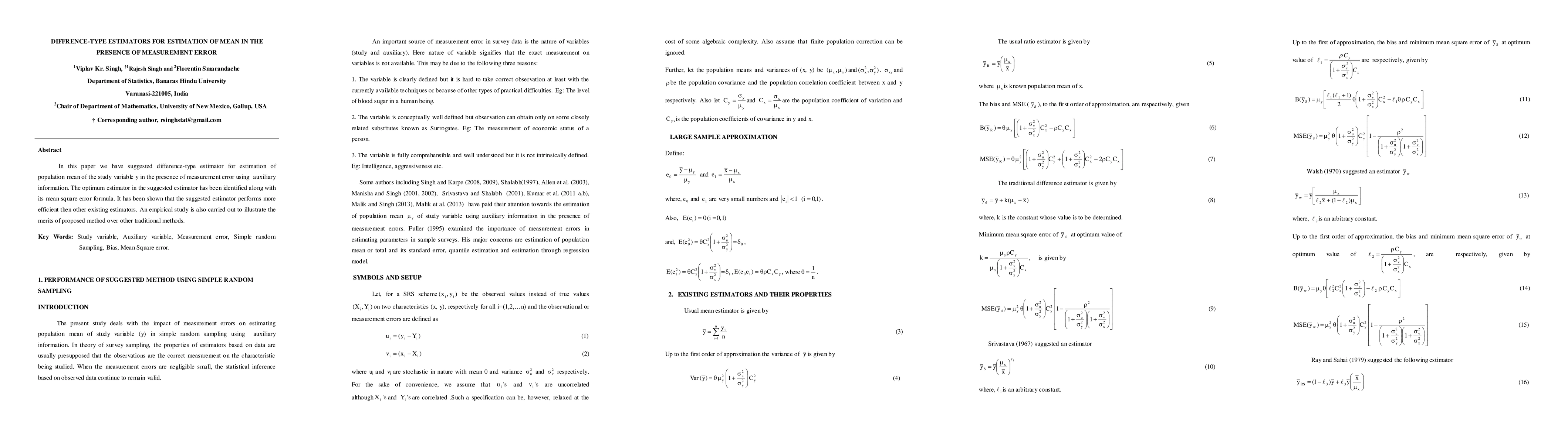 This paper proposes a difference-type estimator for estimating the population mean of variable y, accounting for measurement error with auxiliary information. The study identifies the optimal estimator and demonstrates its superior efficiency compared to existing methods, supported by empirical analysis.