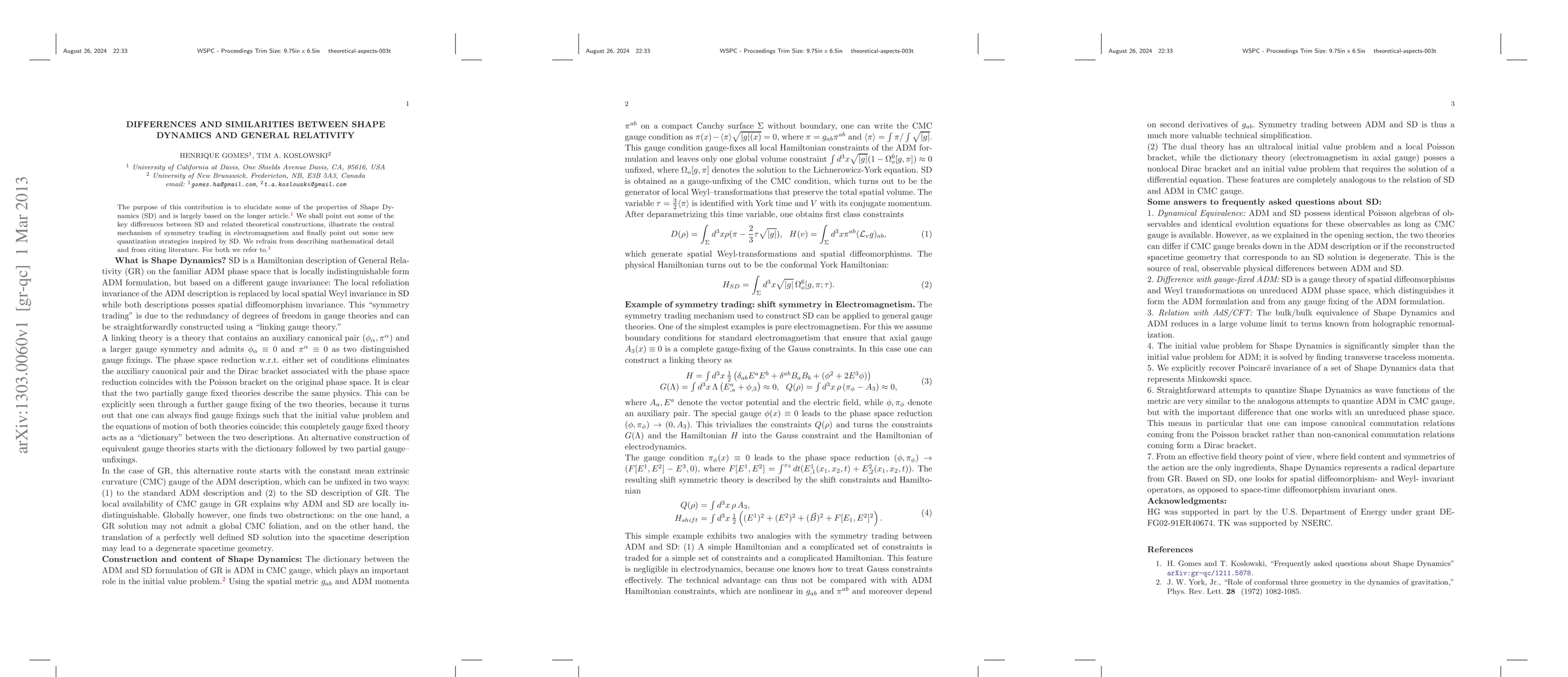 This paper explores similarities and differences between Shape Dynamics (SD) and General Relativity, highlighting key differences and proposing new quantization strategies inspired by SD.