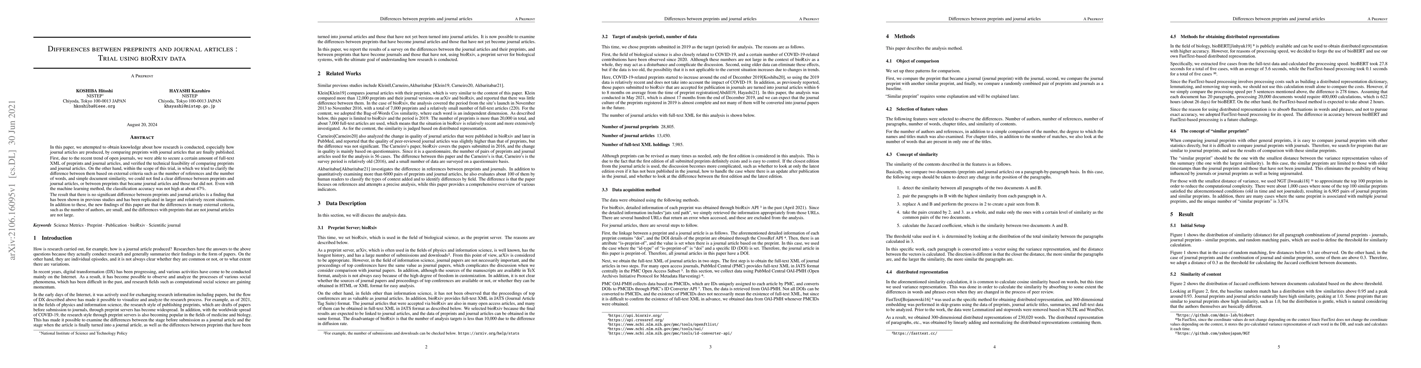 In this paper, we attempted to obtain knowledge about how research is conducted, especially how journal articles are produced, by comparing preprints with journal articles that are finally published. First, due to the recent trend of open journals, we were able to secure a certain amount of full-text XML of preprints and journal articles, and verified the technical feasibility of comparing preprints and journal articles. On the other hand, within the scope of this trial, in which we tried to clarify the difference between them based on external criteria such as the number of references and the number of words, and simple document similarity, we could not find a clear difference between preprints and journal articles, or between preprints that became journal articles and those that did not. Even with the machine learning method, the classification accuracy was not high at about 47%. The result that there is no significant difference between preprints and journal articles is a finding that has been shown in previous studies and has been replicated in larger and relatively recent situations. In addition to these, the new findings of this paper are that the differences in many external criteria, such as the number of authors, are small, and the differences with preprints that are not journal articles are not large.