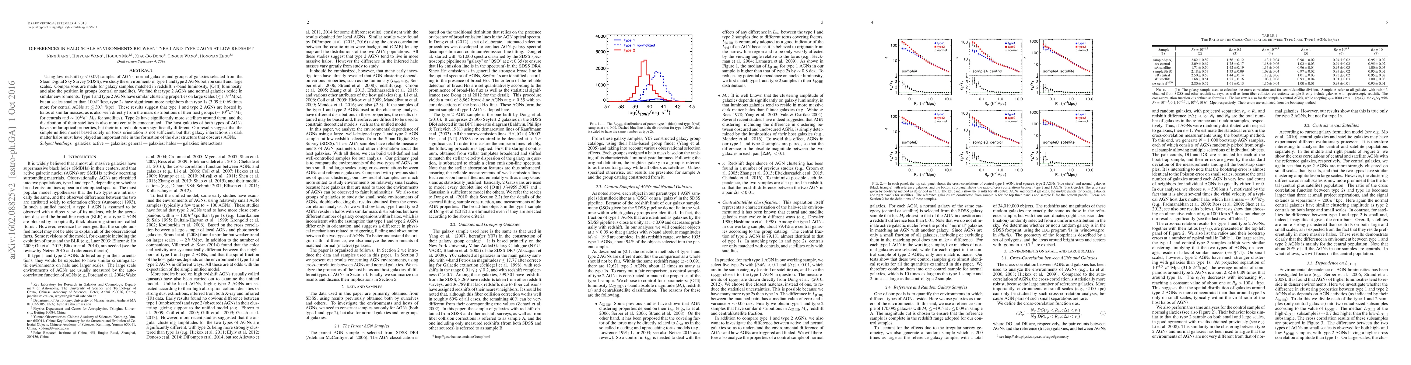 Using low-redshift (z<0.09) samples of AGNs, normal galaxies and groups of galaxies selected from the Sloan Digital Sky Survey (SDSS), we study the environments of type 1 and type 2 AGNs both on small and large scales. Comparisons are made for galaxy samples matched in redshift, $r$-band luminosity, [OIII] luminosity, and also the position in groups (central or satellite). We find that type 2 AGNs and normal galaxies reside in similar environments. Type 1 and type 2 AGNs have similar clustering properties on large scales ($\gtrsim1$Mpc), but at scales smaller than 100 kpc, type 2s have significant more neighbors than type 1s ($3.09\pm0.69$ times more for central AGNs at $\lesssim30$kpc). These results suggest that type 1 and type 2 AGNs are hosted by halos of similar masses, as is also seen directly from the mass distributions of their host groups ($\sim10^{12}h^{-1} M_{\odot}$ for centrals and $\sim10^{13}h^{-1} M_{\odot}$ for satellites). Type~2s have significantly more satellites around them, and the distribution of their satellites is also more centrally concentrated. The host galaxies of both types of AGNs have similar optical properties, but their infrared colors are significantly different. Our results suggest that the simple unified model based solely on torus orientation is not sufficient, but that galaxy interactions in dark matter halos must have played an important role in the formation of the dust structure that obscures AGNs.